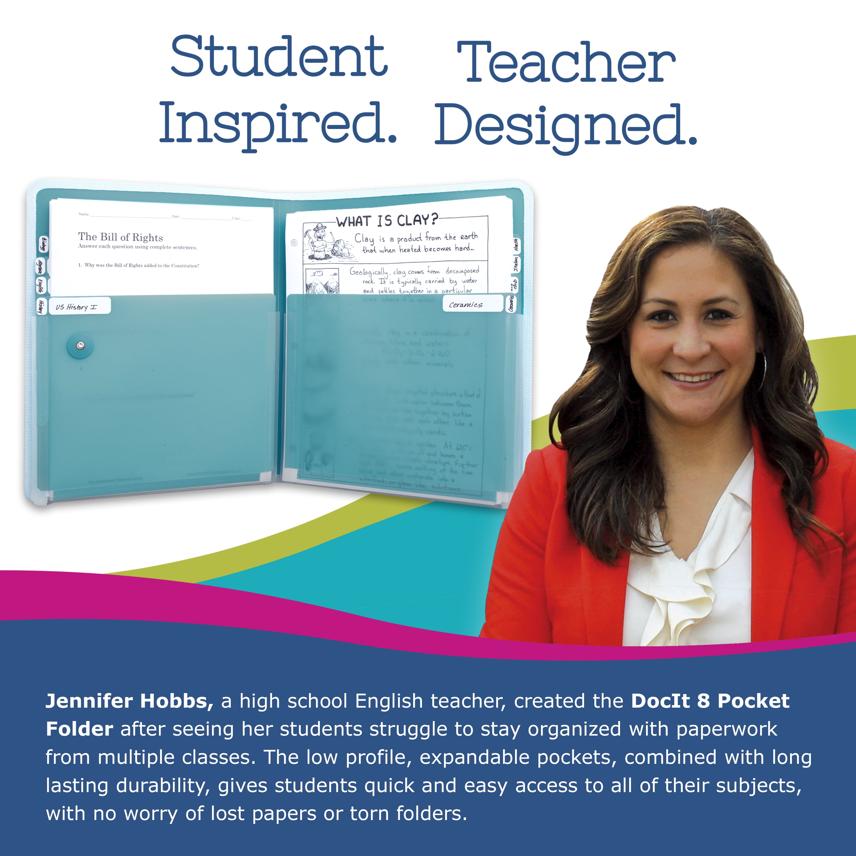 Student Inspired. Teacher Designed. In 2012 we partnered with a High School English Teacher, Jennifer Hobbs, who had an idea for an 8 pocket folder that would help keep her students organized. Jennifer watched for years as her students would struggle with multiple folders that would eventually become overstuffed and tear. She wanted to develop a durable, long-lasting folder that could hold up to 8 subjects. We launched in 2013 and the 8 Pocket Folder was an instant success among students and parents alike.