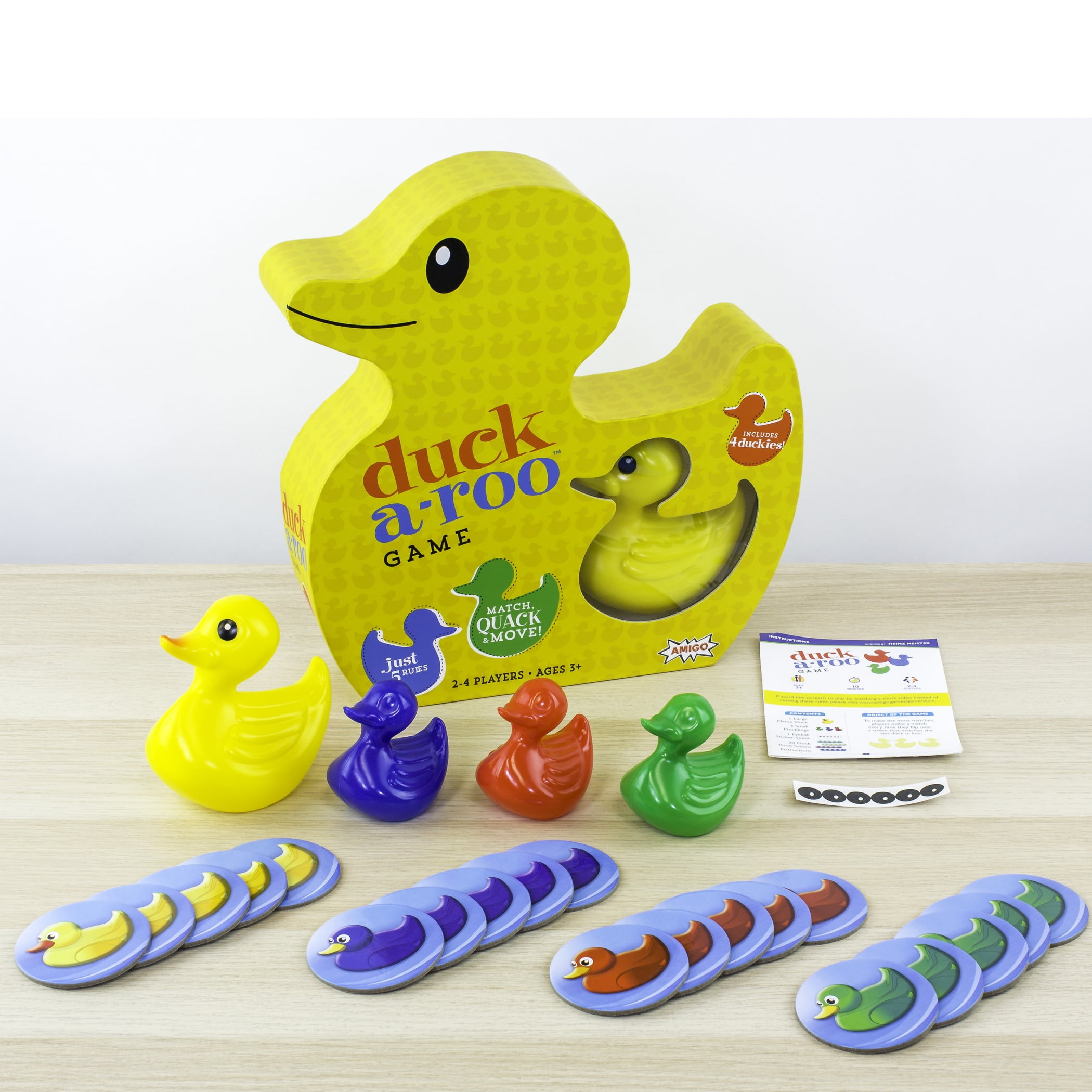 Everything is ducky when Mama Duck has her ducklings in a row. But when players ?ip over a duck pond token that matches the last duckling in line, they call out ?Duck-a-roo!? and swim it to the front. If they don’t make a match they flip it back over. Play continues until there’s one token left, and Mama swims back to the front of the line. Players count up their tokens to see who wins in this educational game of memory and color matching.