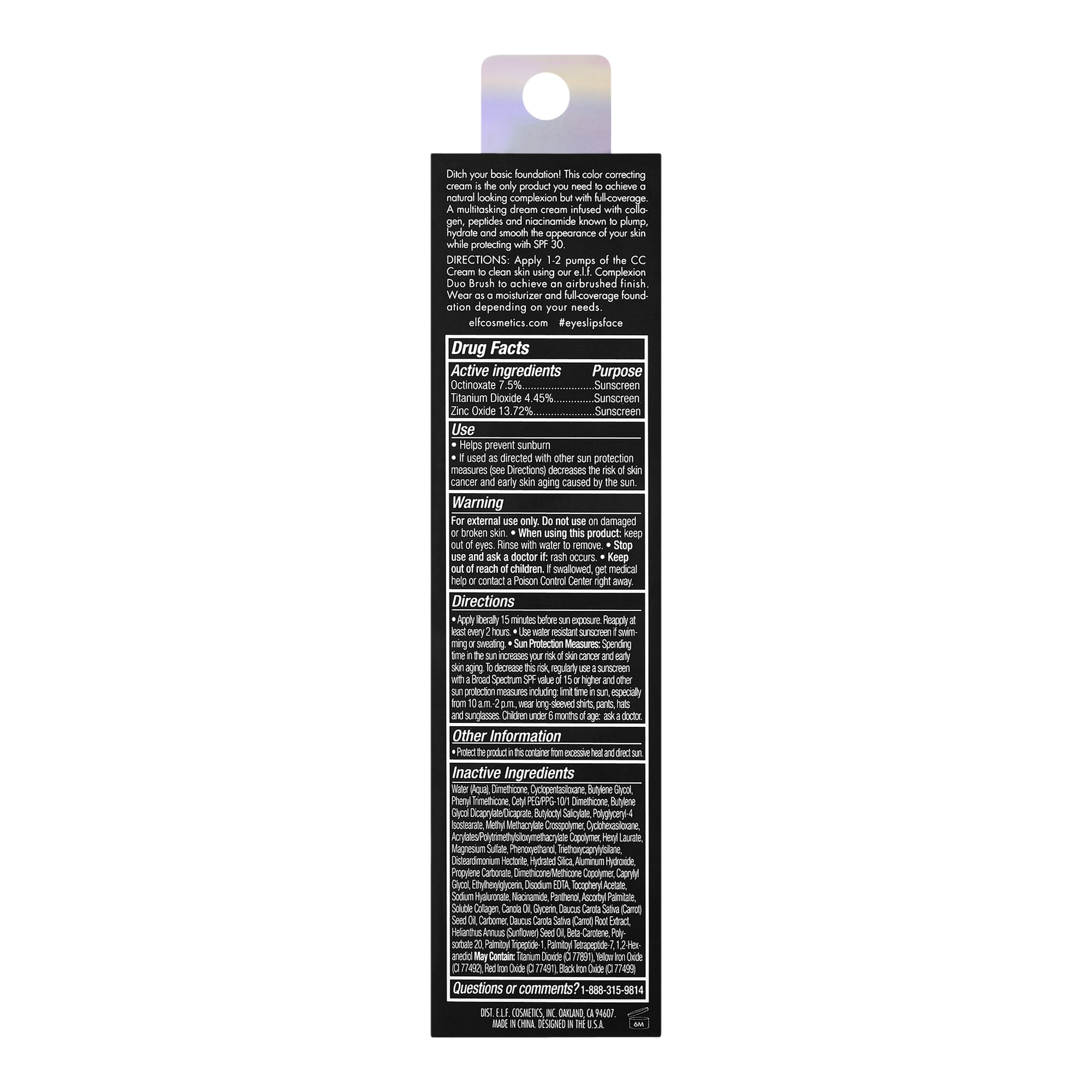 Ditch your basic foundation! The e.l.f. Cosmetics Camo CC Cream is a color correcting cream that is the only product you need to achieve a natural looking complexion but with full coverage. A multitasking dream cream infused with collagen, peptides and niacinamide known to plump, hydrate and smooth the appearance of your skin while protecting with SPF 30. Apply using our e.l.f. Complexion Duo Brush to achieve a flawless, airbrushed finish.