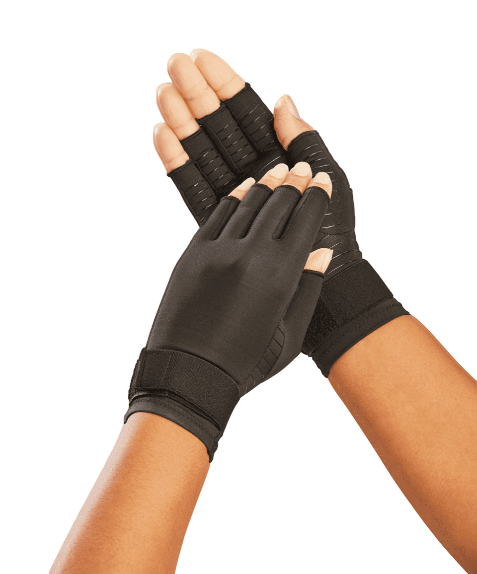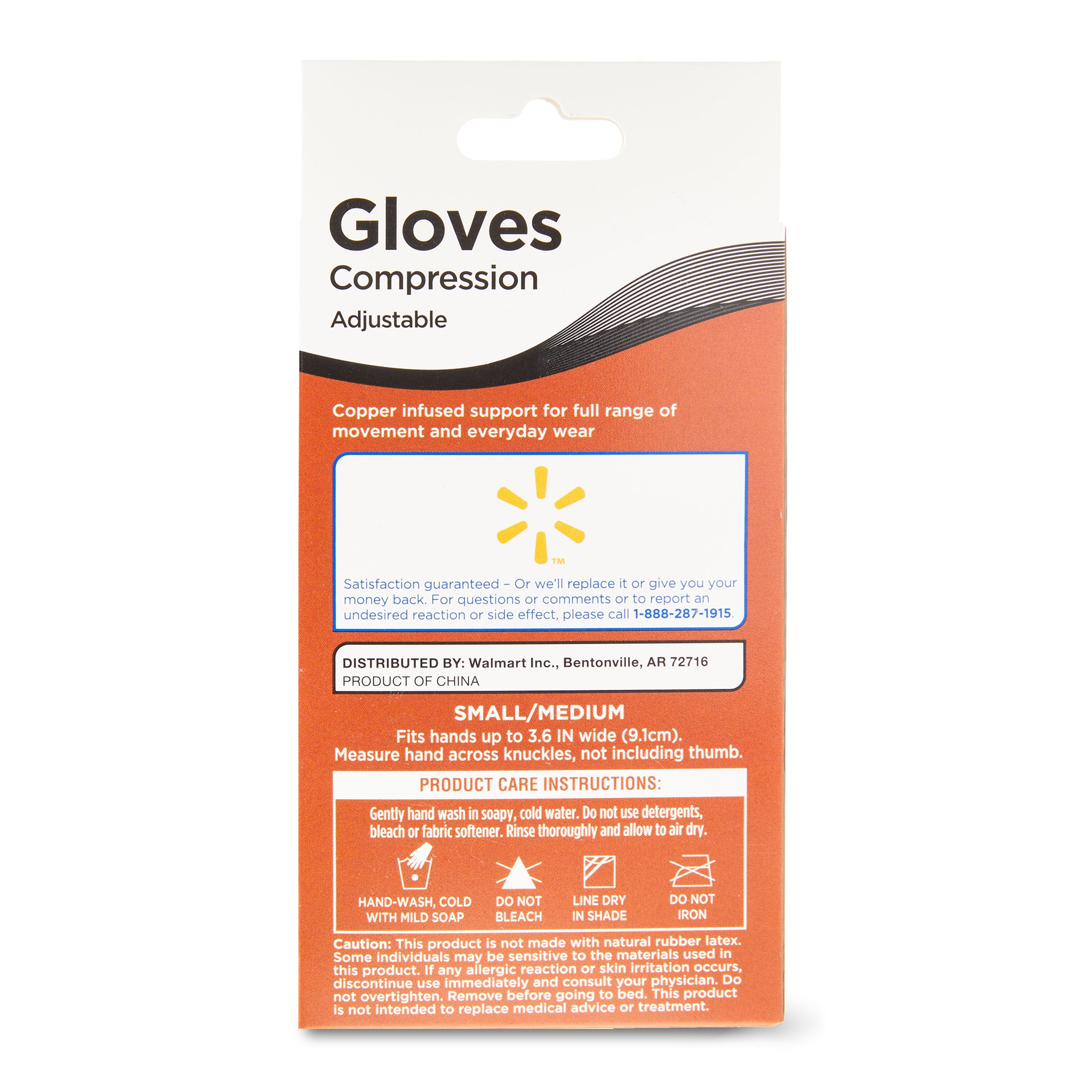 Get the support and compression you need with the Equate Adjustable Compression Gloves, unisex. These gloves support and protect weak, stiff, and sore hands. Featuring copper-infused support for full range of motion and everyday wear, these gloves are ideal for athletes, active weekend warriors, and workers who are constantly typing and/or using their hands. These small/medium gloves fit hands up to 3.6 inches wide and are adjustable. To apply, just put the glove on, secure strap, and adjust until comfortable. Relieve soreness with the Equate Adjustable Compression Gloves.