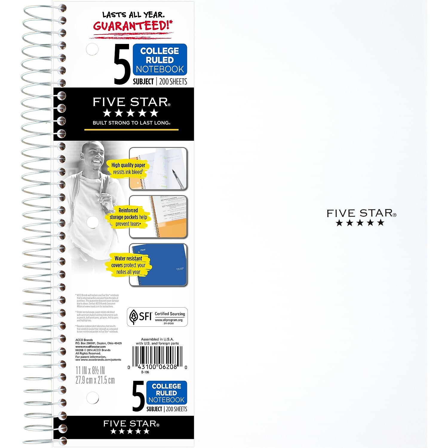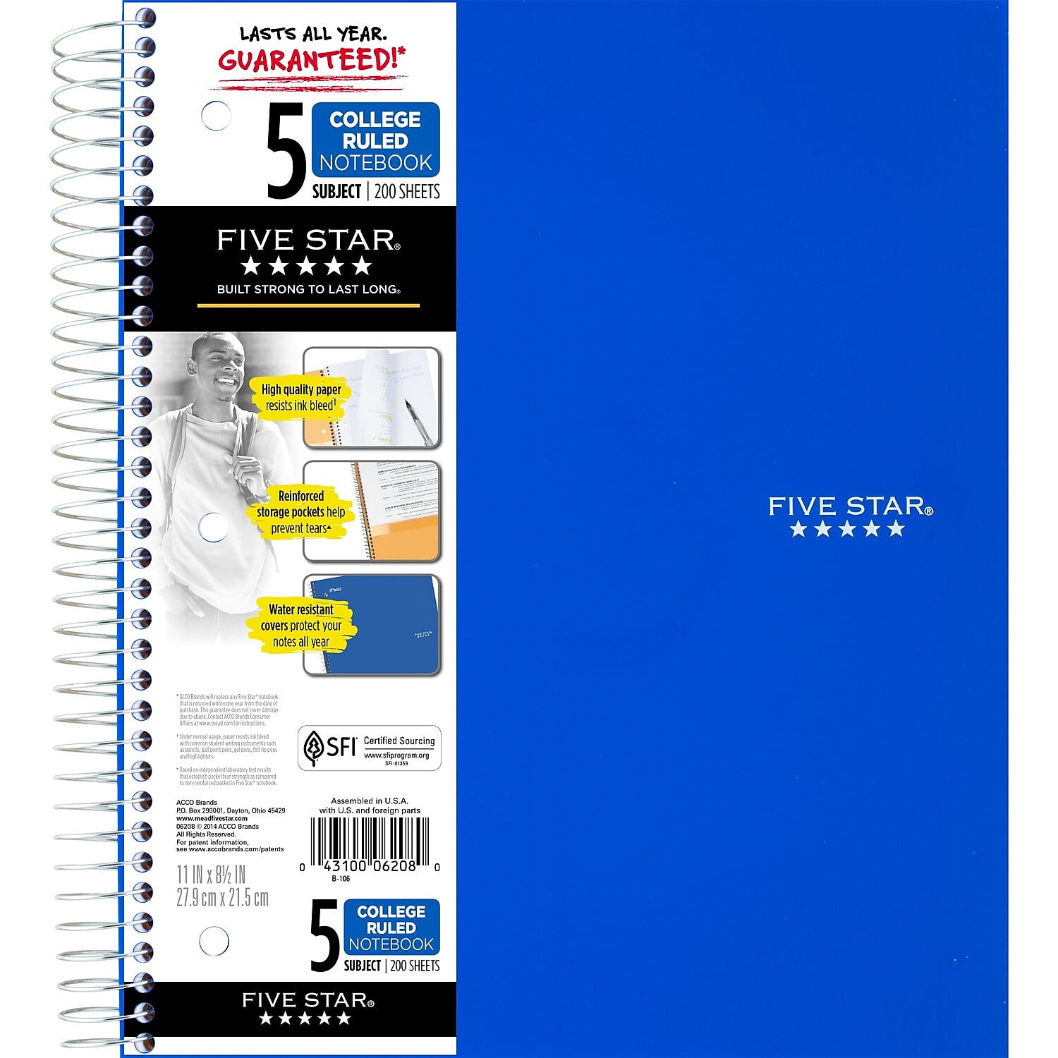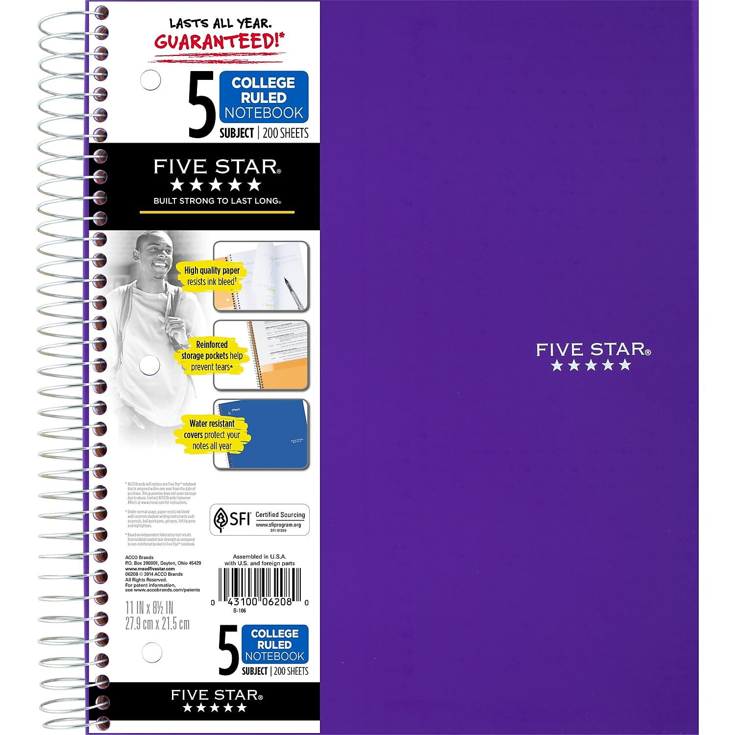 Five Star 5 subject notebooks are college ruled, ideal for class notes and projects.LASTS ALL YEAR. GUARANTEED!* This Five Star 5 Subject Notebook is full of features. Compatible with the Five Star study app, you can easily scan, study and organize notes on your phone! Create instant digital flashcards and sync notes to Google Drive and access them anywhere from any device. 5 subject notebook has 200 double-sided, college ruled sheets, which fight ink bleed. Sheets measure 8 1/2" x 11" and are perforated for easy tear out. Tough pockets help prevent tears and hold 8 1/2" x 11" loose sheets and handouts. Covers are water resistant to protect your notes and our Spiral Lock wire helps prevent snags on clothes and backpacks. Made with SFI certified paper. Notebook is recyclable – just remove the reinforcement tape on the pocket and recycle the rest! Available in Fire Red, Forest Green, Pacific Blue, Amethyst Purple, White and Black. Color chosen for you. LASTS ALL YEAR. GUARANTEED!*. Scan, study and organize your notes with the Five Star App. Create instant flashcards and sync your notes to Google Drive to access them anywhere from any device. 5 subject notebook has 200 double-sided, college ruled sheets that fight ink bleed and are perforated for easy tear out. Sheets measure 8 1/2" x 11" when torn out. Tough pockets help prevent tears and hold 8 1/2" x 11" loose sheets and handouts. Four 2-pocket dividers keep subjects organized. Covers are water resistant to protect your notes and our Spiral Lock wire helps prevent snags on clothes and backpacks. Made with SFI certified paper. Notebook is recyclable – just remove the reinforcement tape on the pocket and recycle the rest! Available in Fire Red, Forest Green, Pacific Blue, Amethyst Purple, White and Black. Colors chosen for customer at random.*Guarantee is valid for one year from purchase date. Does not cover misuse. Go to fivestarbuiltstrong.com for details. Sold as 1 Each.