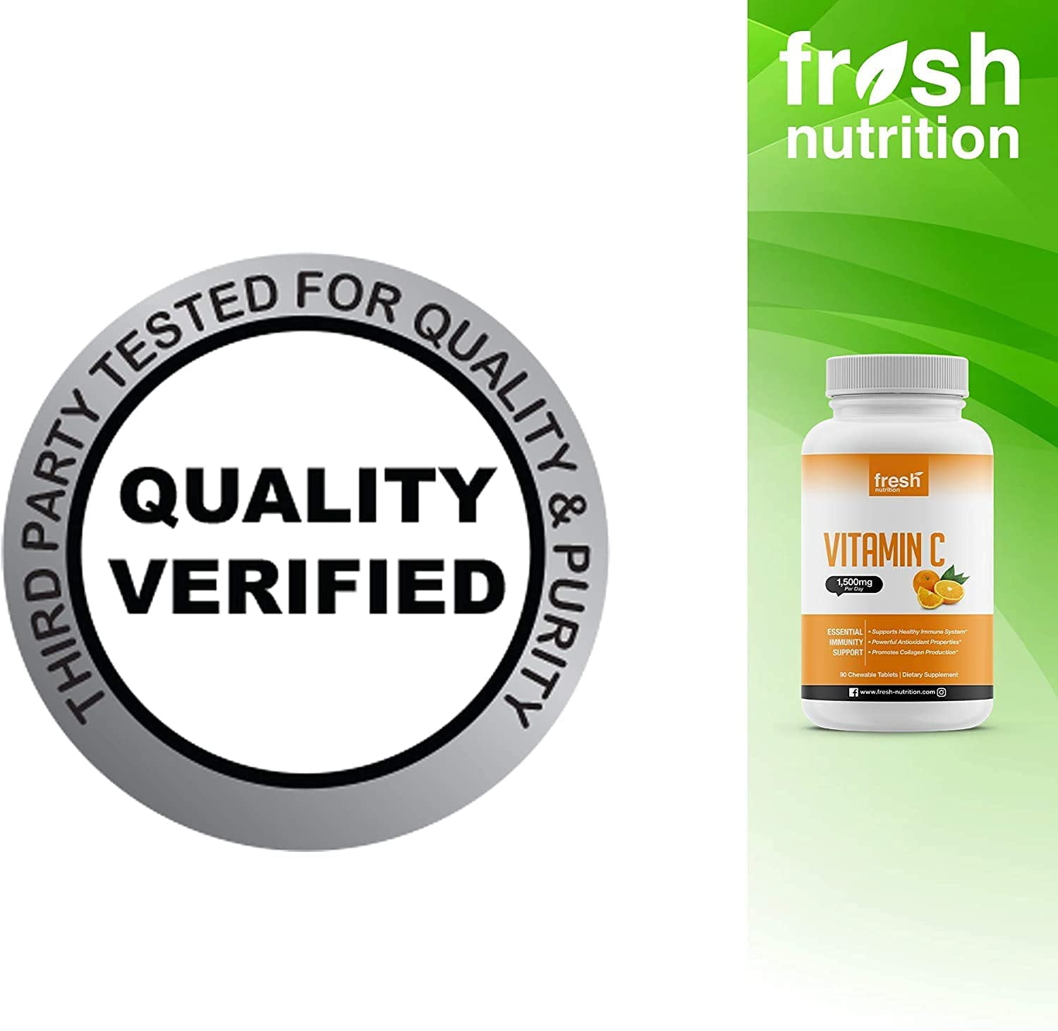 Fresh Nutrition Vitamin C/Vitamina C – There has never been a more important time to boost your natural immunity to help fight off airborne bacteria and viruses. Vitamin C is a well-known anti-viral agent and enzymatic cofactor for immune potentiation. Our Chewable Vitamin C is Vegan friendly, GMO, Soy, and gluten free, and free from artificial flavors, colors, or preservatives. Each chew contains 500mg of Vitamin C for a total serving of 1500mg. Fresh Nutrition sources all-natural ingredients for our Vitamins and Supplements which are third-party tested to ensure purity. This ensures the end result is a trusted product that contains exactly what is promised.Vitamin C – Powerful 1500mg Per Day Immune Support – Tasty Chewable Vitamin C Supplement All Year-Round Potent Support – Vegan Friendly, Non-GMO, Gluten & Soy Free – All Natural Vit C immunity Booster
