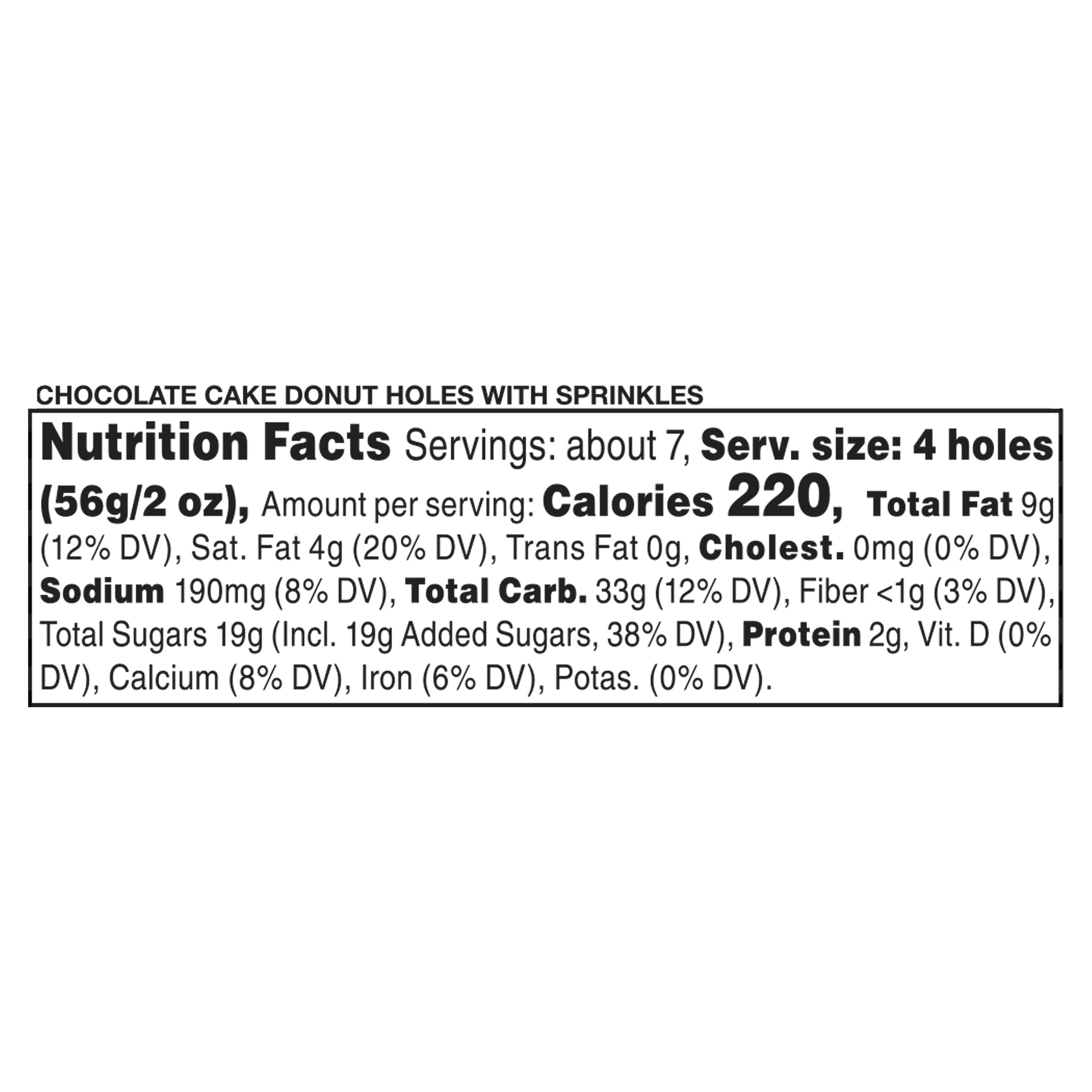 Our Freshness Guaranteed Chocolate Donut Holes with Sprinkles will sweeten your day. 14 ounces of decadent chocolate cake donut holes covered in rainbow sprinkles. With seven servings per package, this exciting item is perfect for parties or family gatherings. These donut holes are also great for everyday breakfast along with a cup of coffee or glass of milk! Order online or grab these delicious Chocolate Donut Holes with Sprinkles from your local Walmart today! Freshness Guaranteed provides you and your family with high-quality fresh food that saves you time and money. Convenient solutions with value-added in every Freshness Guaranteed item.