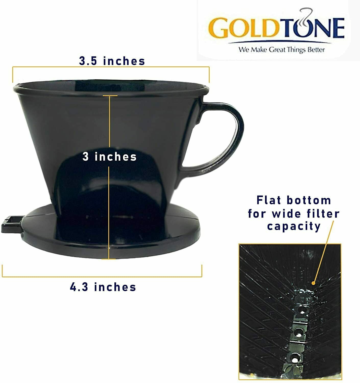 Introducing GOLDTONE’s sturdy portable pour over coffee filter cone for all your manual coffee brewing desires! Our non breakable, solid pour over coffee filter is ideal for your kitchen, office, or camping and hiking adventures; Sporting a wide base with a flat bottom which allows maximum filter capacity, thus, brewing you a delicious gourmet cup of coffee! Made from BPA Free plastic, our coffee dripper is durable, easy to clean and will last a lifetime with proper care.