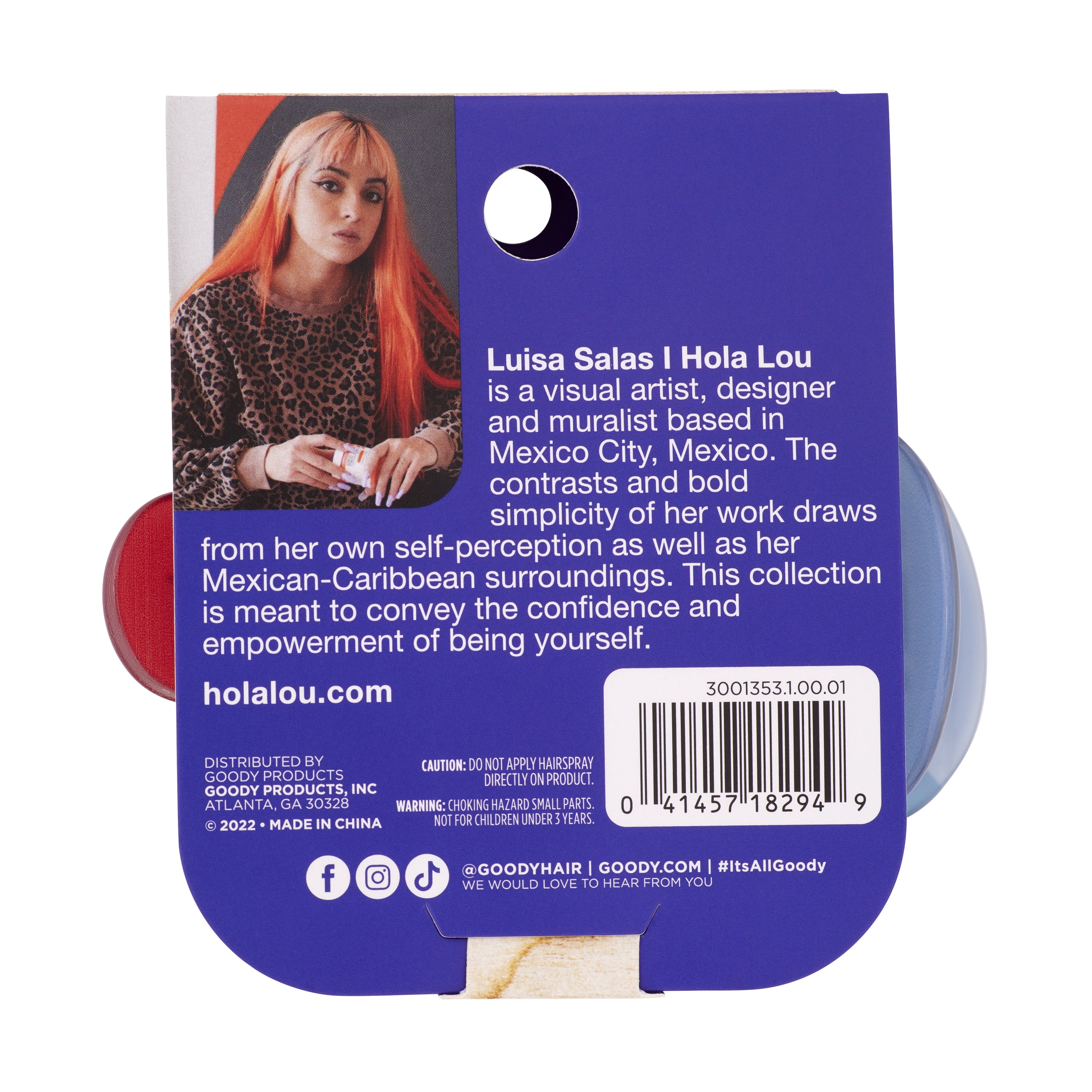 Goody Tru is a creative collaboration that honors the unique vision of some of today’s most compelling multi-cultural artists while also celebrating individuality and self-expression. These artists have come together with the most-loved hair accessory brand in the world to create a unique style narrative that’s all about embracing a brighter, bolder you. Only at Walmart! The Goody Tru x Hola Lou Ouchless® SlideProof™ Medium Claw Clips can be worn multiple ways and feature a uniquely sculpted design and translucent material with a blue stained glass-like look.Goody Tru X Hola Lou Collab Medium Slideproof™ Claw Clip Blue, 2 CT SlideProof™Grip Multiple ways to wear For all hair types Translucent blue and orange Medium sized claw clips Luisa Salas (aka Hola Lou) is a visual artist, designer and muralist based in Mexico City, Mexico. The contrasts and bold simplicity of her work draws from her own self-perception as well as her Mexican-Caribbean surroundings. This collection is meant to convey the confidence and empowerment of being yourself. holalou.com