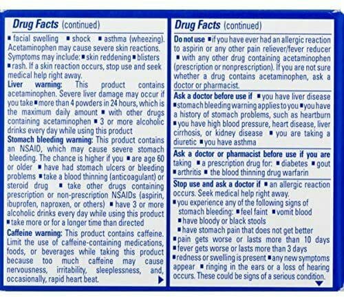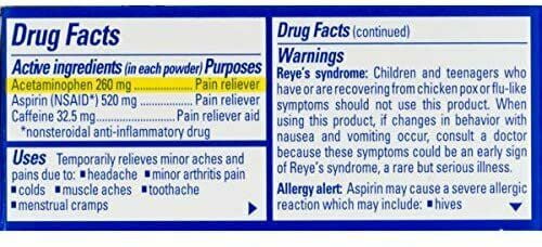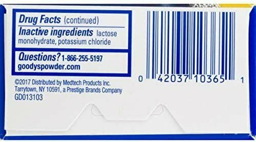 No more pills! Tackle those head troubles with the convenience of Goody’s Headache Powder, the tried and true, classic solution for fast pain relief. Remember, when you’ve got a headache, there’s fast, and then there’s Goody’s fast.Temporarily relieves minor aches and pains due to: Headaches, minor arthritis pain, muscular aches, colds, toothaches, menstrual pain. Ingredients: Caffeine 32.5mg; Acetaminophen 260mg; Aspirin (nsaid: Nonsteroidal anti-inflammatory drug) 520mg