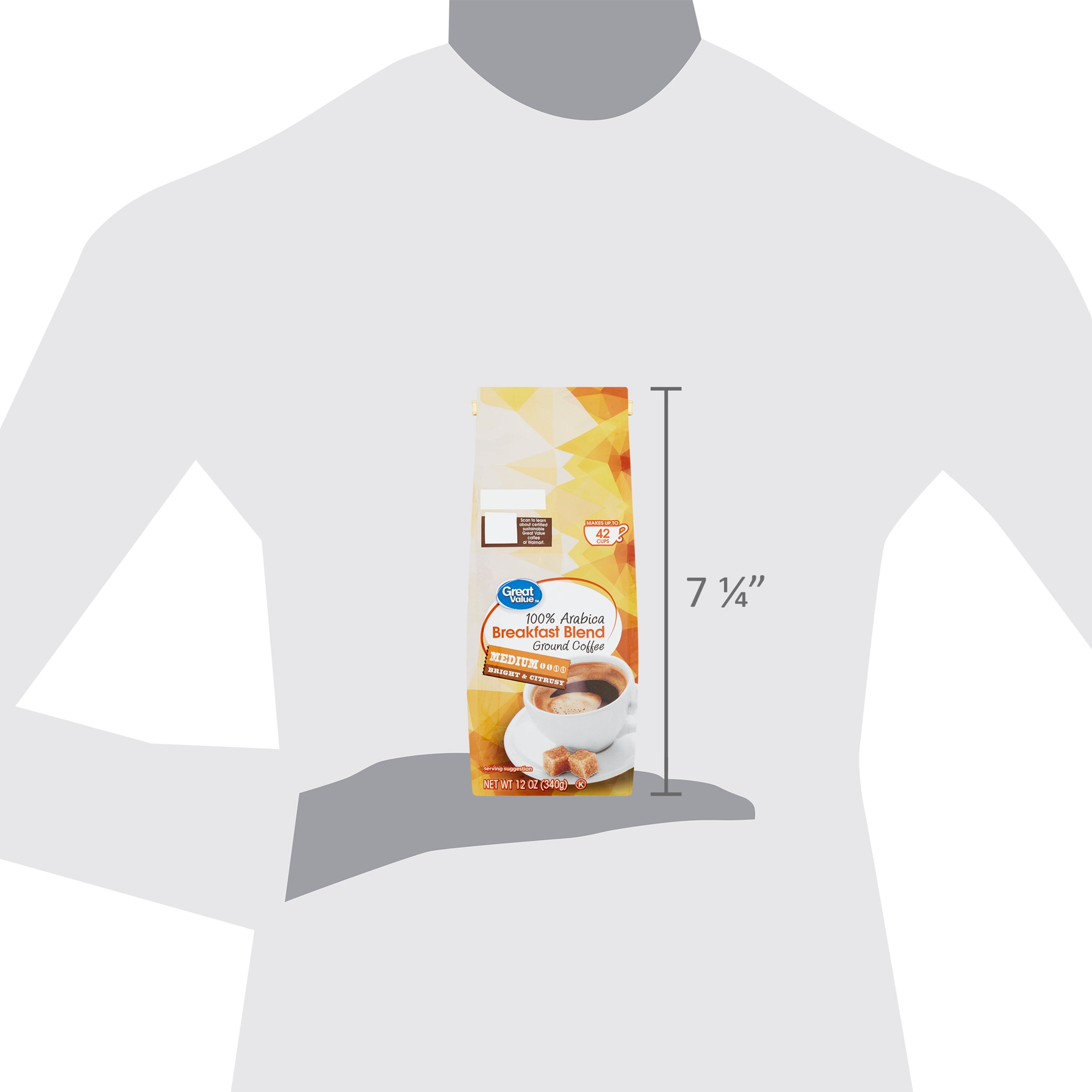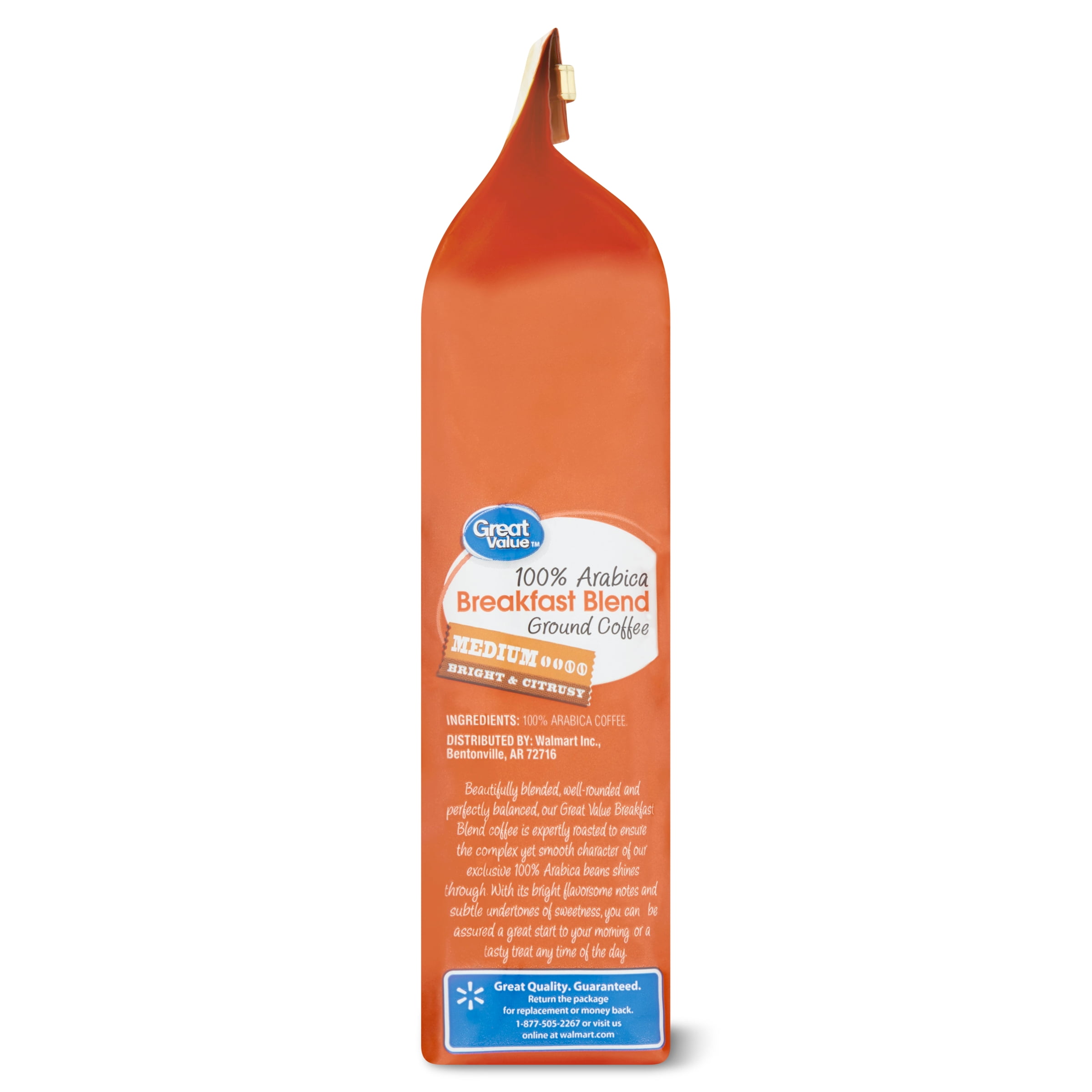 Start your day off right with a fresh, steaming cup of Great Value 100% Arabica Breakfast Blend Medium Ground Coffee. This 12oz package of smoothly ground coffee beans makes up to 42 delicious cups of Breakfast Blend flavored coffee that will impress even the pickiest of coffee drinkers. The medium roast Breakfast Blend features a bright citrus flavor that will perk you right up in the morning. Amazing on its own, this coffee also tastes great with syrups, creamers or sweeteners. Excellent for breakfast with the family or brunch with friends, this perfectly packaged bag will earn a permanent place in your pantry or break room. With Great Value 100% Arabica Breakfast Blend Medium Ground Coffee, you’ll have more time and energy to spend on the things in life that matter most.