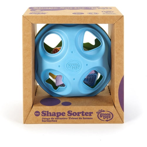 The My First Green Toys Shape Sorter puts an eco-friendly spin on a classic play pattern. Made from food-safe, 100% recycled plastic milk jugs that save energy and reduce greenhouse gas emissions, the Shape Sorter helps develop recognition of shapes and colors while also encouraging eye-hand coordination, problem solving, and fine and gross motor skill development. The two-part elliptical Shape Sorter and 8 colorful shapes (2 stars, 2 circles, 2 squares, 2 triangles) are the perfect size and weight for little hands. Each piece slides easily into the chute cut-outs on both the top and bottom of the Sorter, which opens with a simple twist, separating the two halves and letting the pieces out again. No BPA, phthalates, PVC or external coatings, and also meets FDA food contact standards. Dishwasher safe for easy cleaning. Packaged with recycled and recyclable materials and printed with soy inks. Recommended for ages 0 months and up. Dimensions: Sorter: 8 diameter; Shapes approximately XH.
