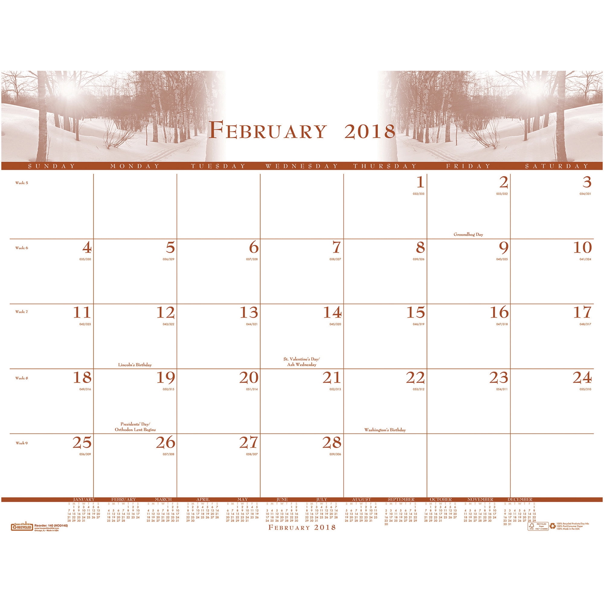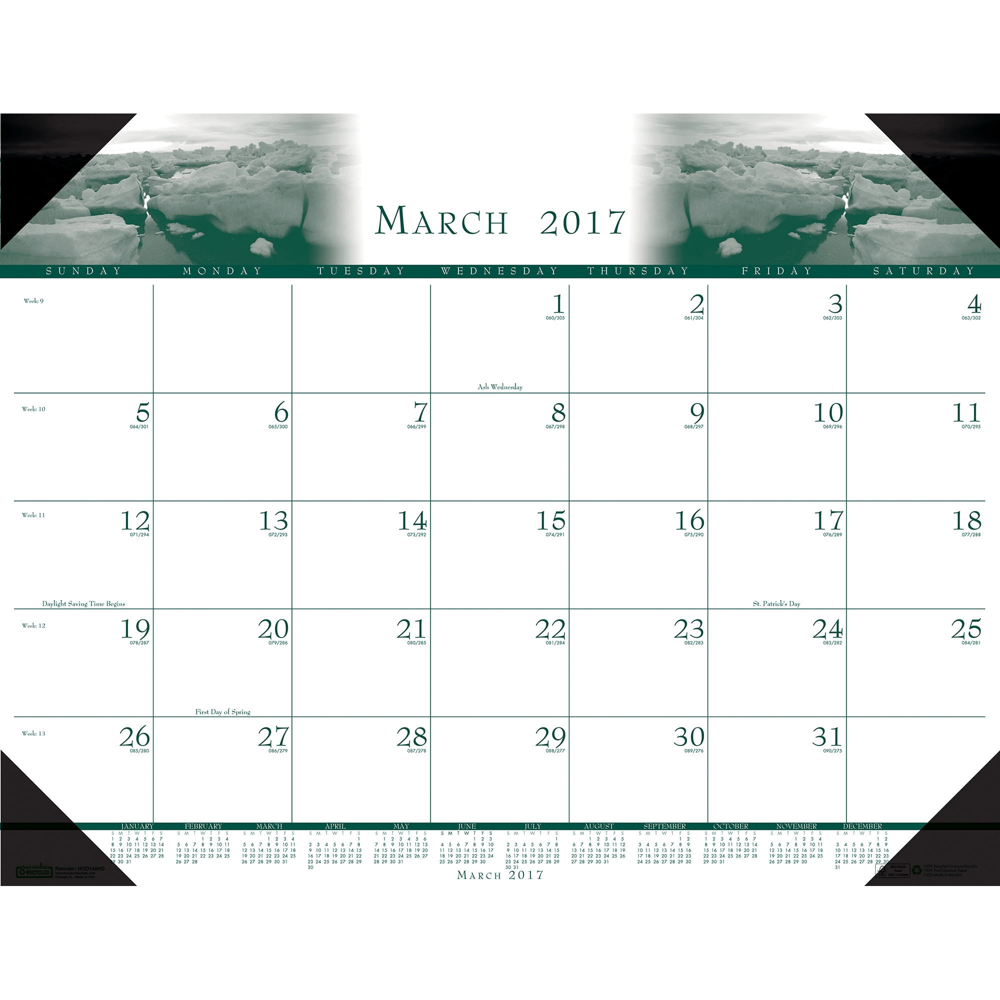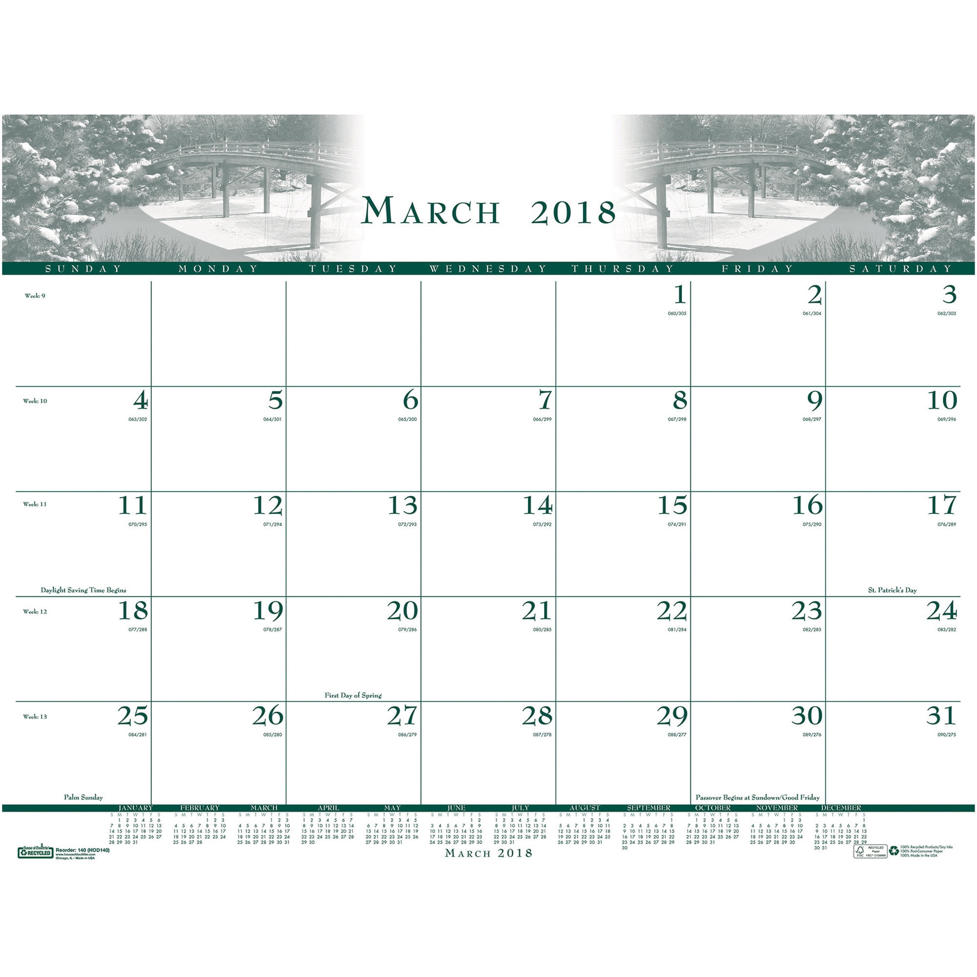 House of Doolittle Illustrated desk pad calendar 12 months with sheets printed in three colors; green, blue and brown on 100% recycled paper containing 100% post-consumer waste with soy inks and reinforced black leatherette corners. Made in the USA.