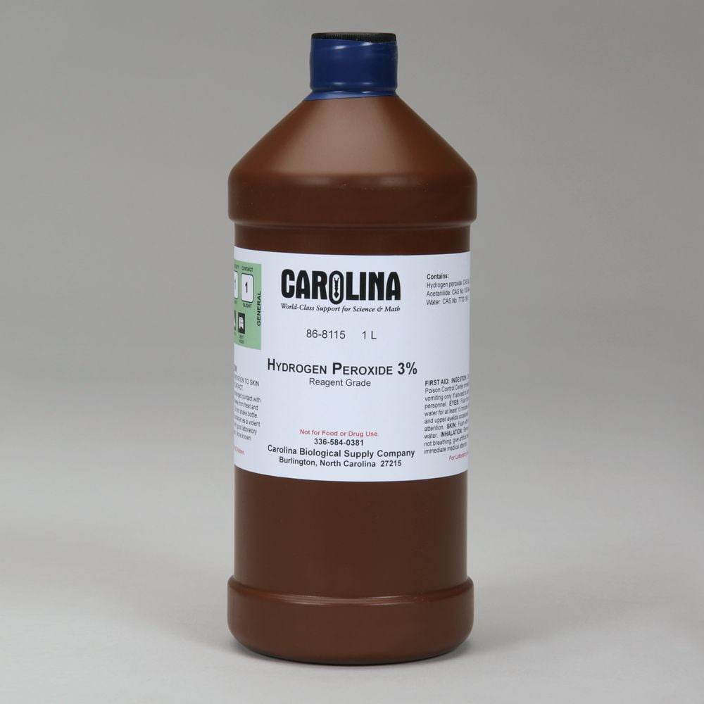 Synonym: Peroxide Formula: H2O2 Formula Wt: 34.02 CAS: 7722-84-1 Characteristics: Clear and colorless Notes: Stabilized Storage Code: Green – general chemical storage Reagent Grade – High purity. Often equal to purity standards set by the American Chemical Society (ACS). Use for quantitative analysis. This product is specially made for use in science education laboratories; no certificate of analysis is available.Hydrogen Peroxide, 3%, Reagent Grade, 1 L