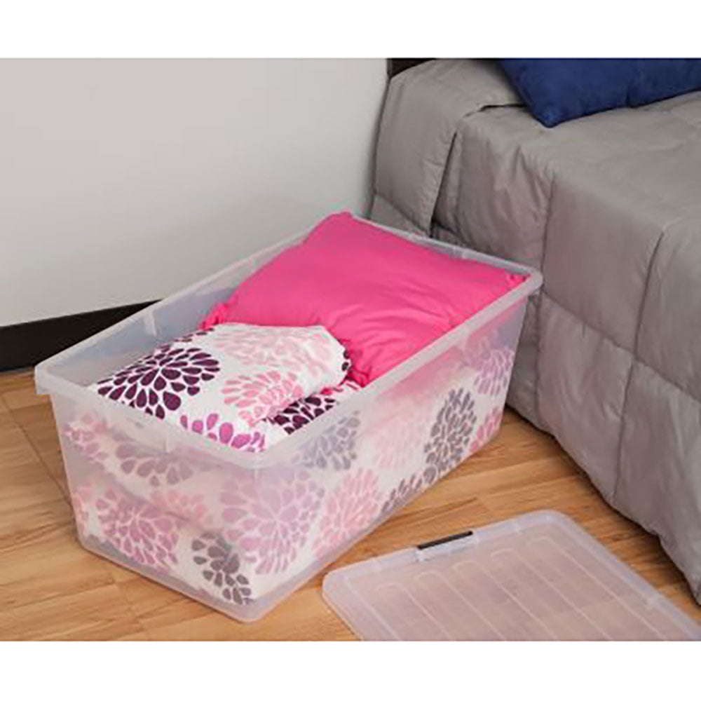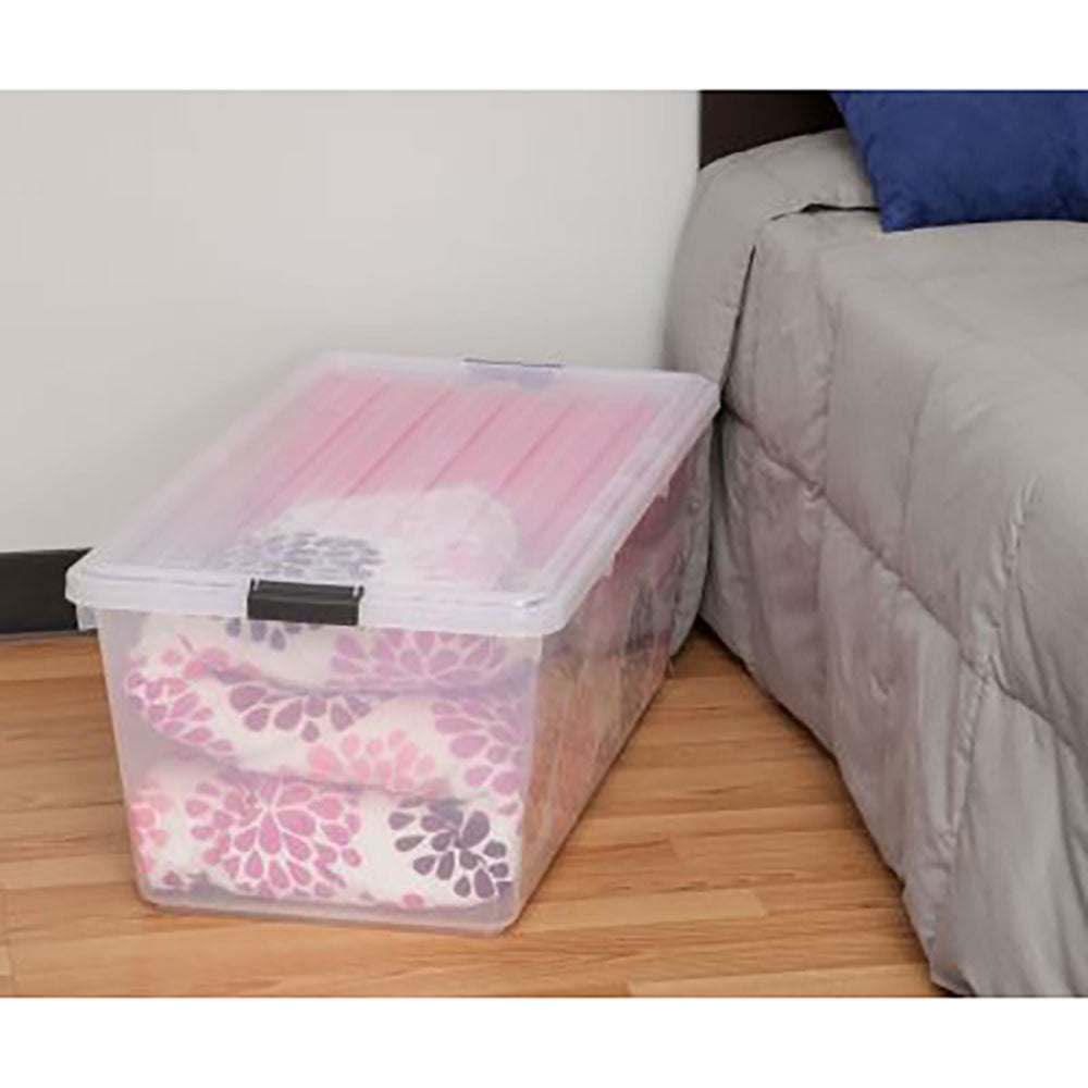 The IRIS USA, 91 Qt. Buckle Down Plastic Storage Box is made of high-quality clear polypropylene for strength, durability and easy viewing of contents. This storage box features snap-down buckles for secure handling. This is just another way that IRIS USA provides solutions for everyday living.