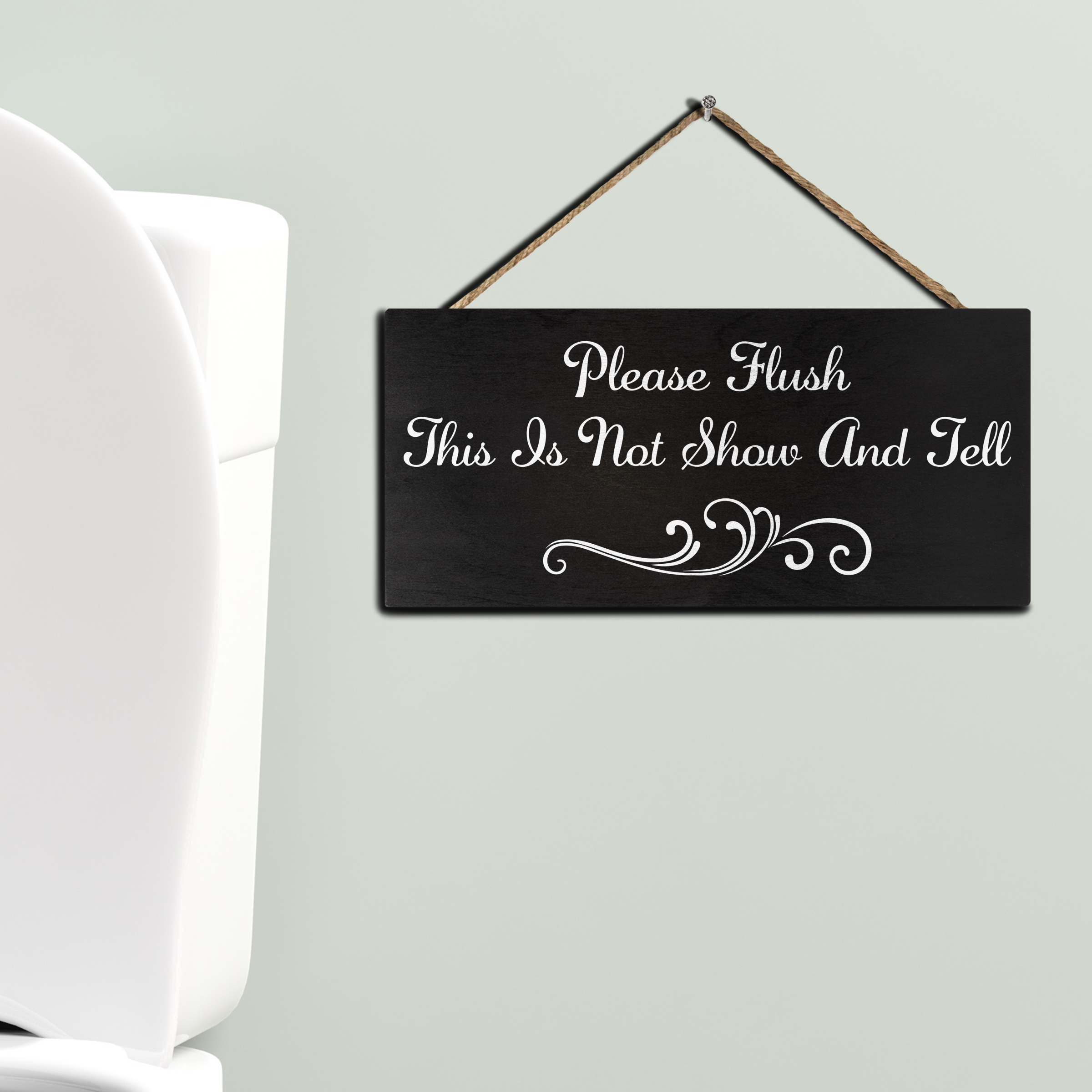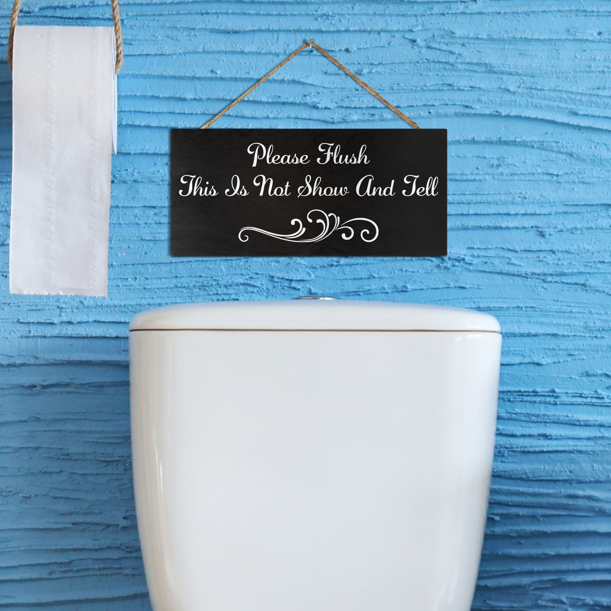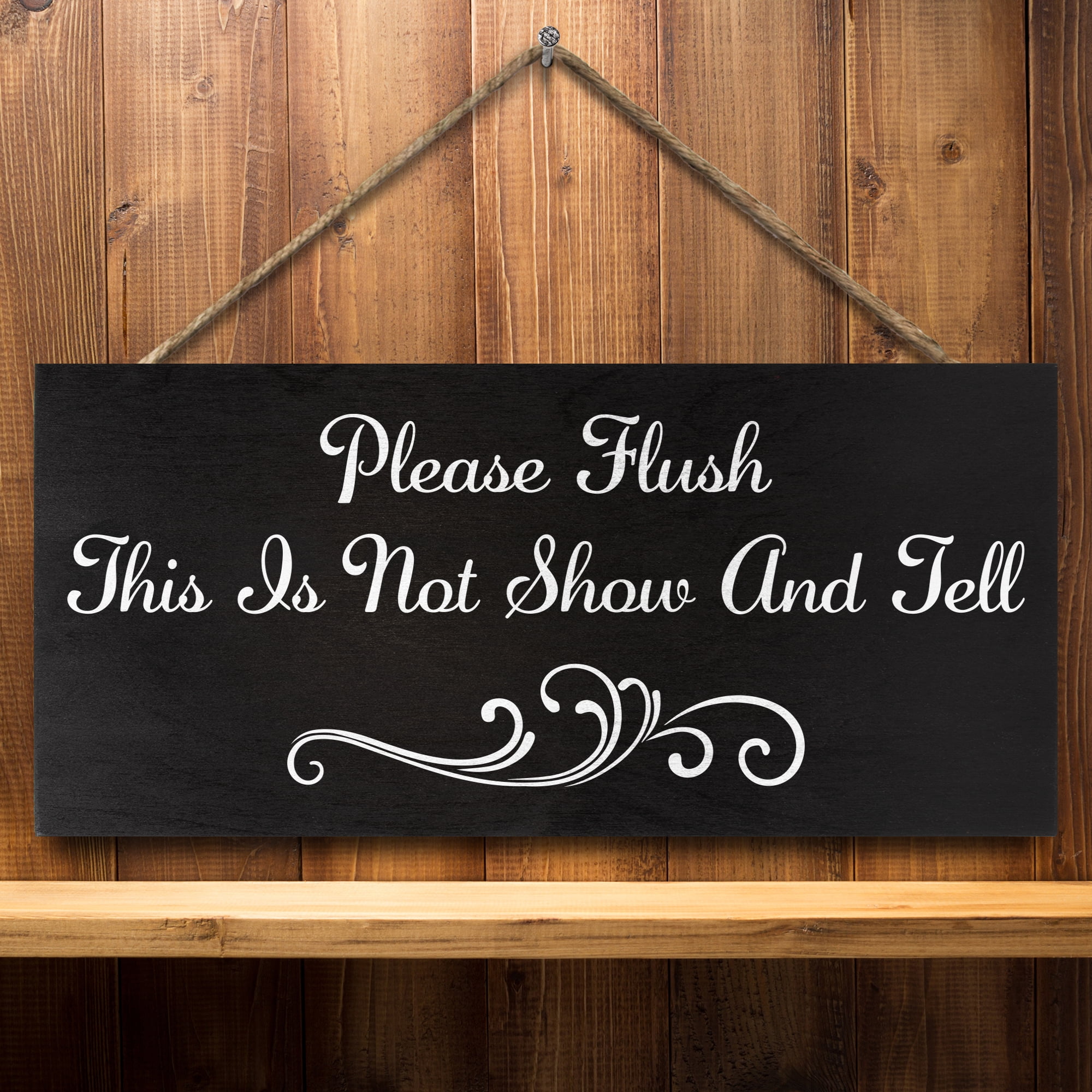 About: This funny and humorous decorative, hanging bathroom sign reads "Please Flush This Is Not Show and Tell." This wooden sign has an easy-to-read font and is black with white lettering. Sign dimensions are 6x13in and it is decorated with a jute string for hanging. This fun, restroom decor sign will look nice hanging on a wall or door in your primary bathroom, half bathroom, or kids bathroom – wherever your family, friends, and guests will see this sign and get a good laugh from it! Bathroom Wall Decor: This fun wooden plaque is a great accent sign that will add laughter to your bathroom or a half bath. This sign fits into many home decor styles & themes including Rustic, Farmhouse & Modern. Sign fits perfectly with farmhouse wall decor, rustic bathroom decor, boho bathroom decor & is a nice addition to your bathroom wall art. Prop up a sign on a wall shelf, bathroom shelves, or floating shelves, in a bathroom organizer, bathroom vanity & bathroom shelf over toilet. Gift Ideas for Friends & Family: This hilarious saying & humorous farmhouse decor home accent about using the bathroom makes for a unique gift idea! This amusing restroom sign is sure to make your guests smile and laugh! This wood quote sign is a great gift idea for a kid’s bathroom, birthdays, Christmas & other special occasions. Every time someone sees this bathroom sign, it will be a great reminder of the special relationship you share! Also a comical sign for any restaurant & bar! Material: Our signs are sourced from high-quality wood, which gives our customers a durable, long-lasting decor sign they can appreciate over the years. Our manufacturing process consists of using state-of-the-art UV Printers, that instantly dry the ink onto each sign once the printing process has been completed. We source from lumber mills that carry quality wood material. Our signs are not made from MDF nor do we use stickers.