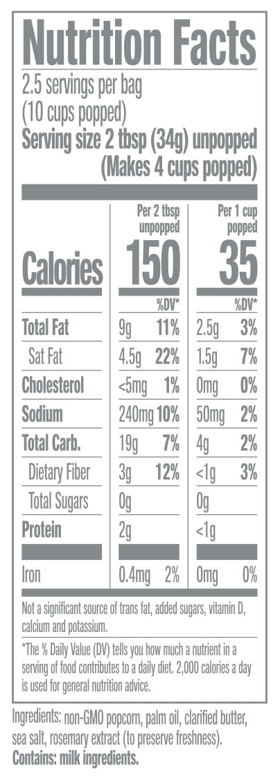 Brand new from JOLLY TIME! This deliciously simple microwave popcorn contains just 4 ingredients… just clarified butter (also known as ghee), sea salt, popcorn and palm oil. This healthy snack has 0 trans fat, 0 grams of sugar and is only 35 calories per cup of popped popcorn! Plus it is gluten-free and made with Non-GMO kernels. Each box of Simply Popped contains 24 (3 oz.) regular sized microwave popcorn bags.JOLLY TIME Microwave Popcorn, Simply Popped, 3 Oz, 24 Ct
