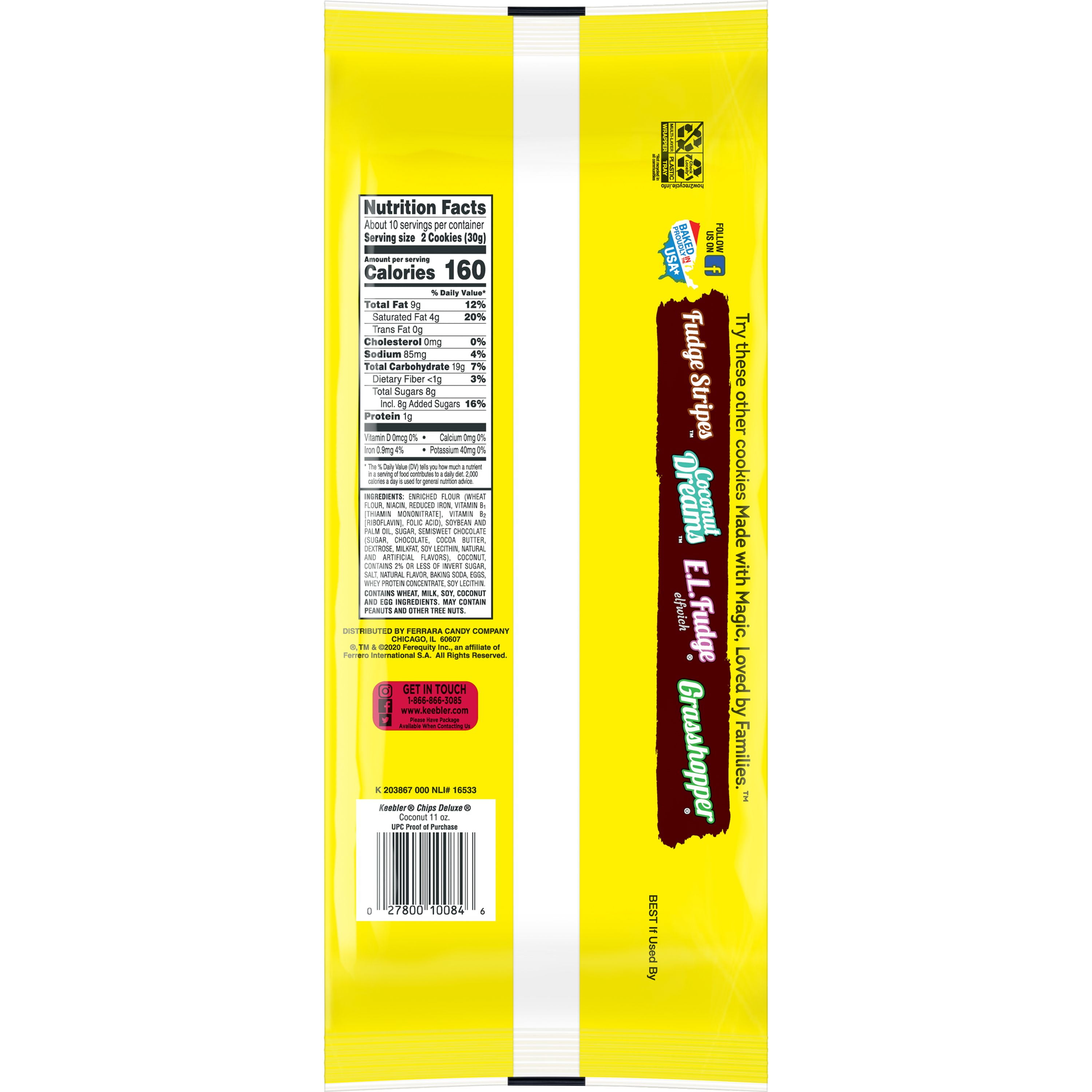 Add some sparkle to your snack routine with Keebler Chips Deluxe Coconut Cookies. These crispy, crumbly cookies are enhanced with delicious chocolate chips, bits of coconut, and a touch of Elfin Magic for the perfect level of sweetness to perk you up when it’s time for a snack. You never know when a challenging day will call for a sweet treat, so carry a couple of cookies in your tote for on-the-go snack attacks while commuting, bring a tray in the car for a road trip, or just munch on them from the comfort of your home. Add a few to your kid’s lunchbox for a sweet surprise, stash some at work to share with coworkers, or keep them all to yourself? we won’t judge! If your favorite snacker is far away, consider adding a tasty tray of Chips Deluxe cookies to care packages or gift boxes. These cookies will be right at home as part of a party spread for game night, birthdays, and other gatherings throughout the year. Take a moment to enjoy the crispy, crunchy, sweet satisfaction of Keebler Chips Deluxe Cookies.