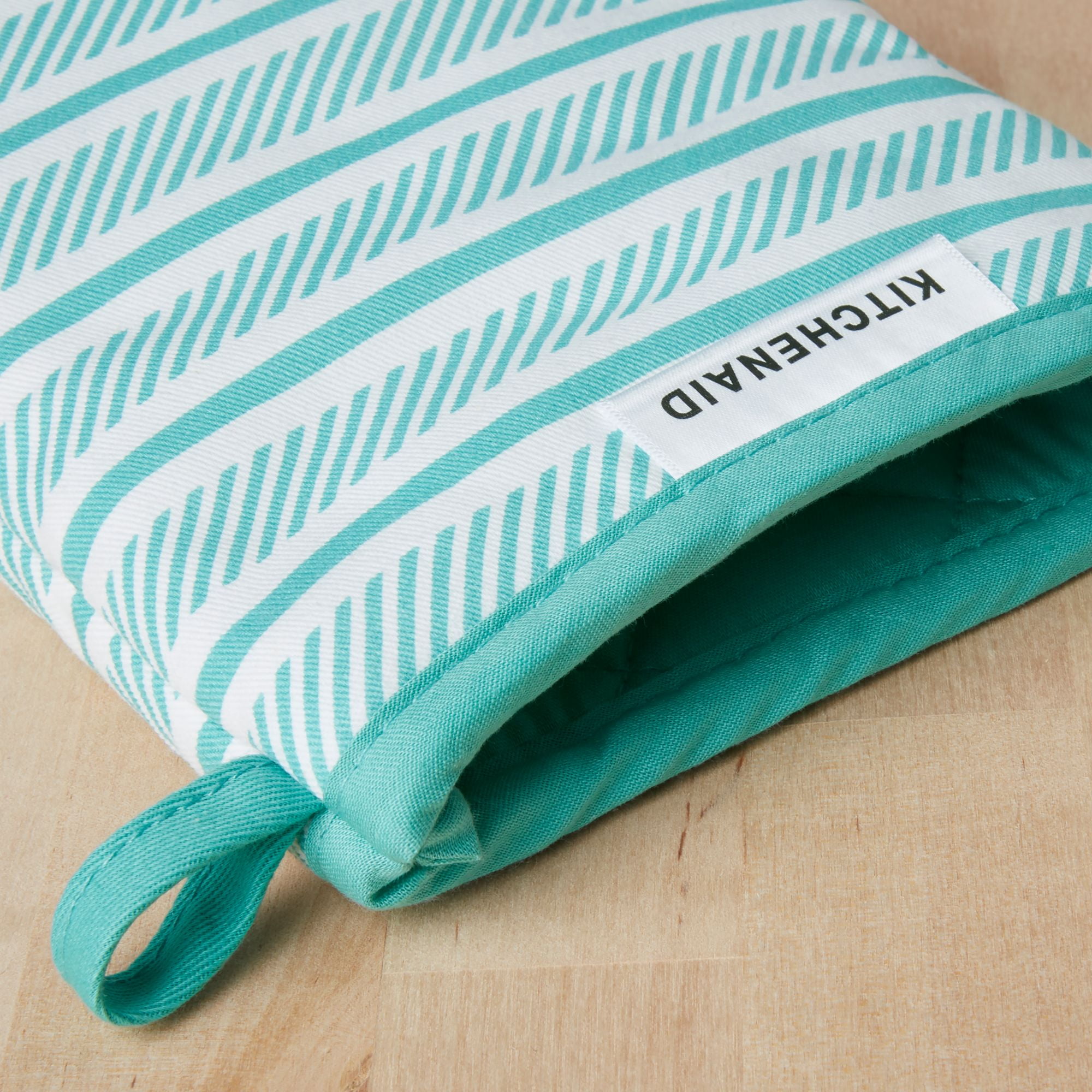 Safely handle your hot pots and pans with the KitchenAid Albany 2-Piece Mini Oven Mitt Set. These KitchenAid mini mitts each measure 5.5 inches wide by 8 inches long for easy on and off use while handling hot dishes. The durable, cotton fabric on the outside and polyester lining offers comfort and insulation. Clear printed silicone on the mitts is heat resistant and ensures a more firm and secure grip. Featuring a convenient hanging loop to easily display or store them when not in use. These mini mitts are machine washable for easy care.