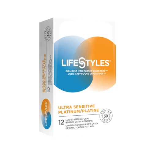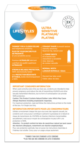 Feel the experience with our thinnest yet highly durable design so you can share a connection with your partner that feels all-natural. LifeStyles Ultra Sensitive Platinum condoms are thinner than our standard latex condom for a closer, more intimate feeling and heightened sensitivity. These condoms are designed with a straight shape and smooth texture and offer a “getting closer” feeling for the deepest, closest level of intimacy. LifeStyles Ultra Sensitive Platinum condoms are 100% electronically tested for added reliability and protection against unwanted pregnancies and STIs. You could say this one’s the strong and sensitive type. These contraceptives are also designed with a reservoir tip for safety and comfort. LifeStyles Ultra Sensitive Platinum condoms are made of 100% natural, low-scent, premium quality rubber latex and are specially lubricated with UltraGlide, a premium silicone lubricant that provides maximum pleasure for both partners.