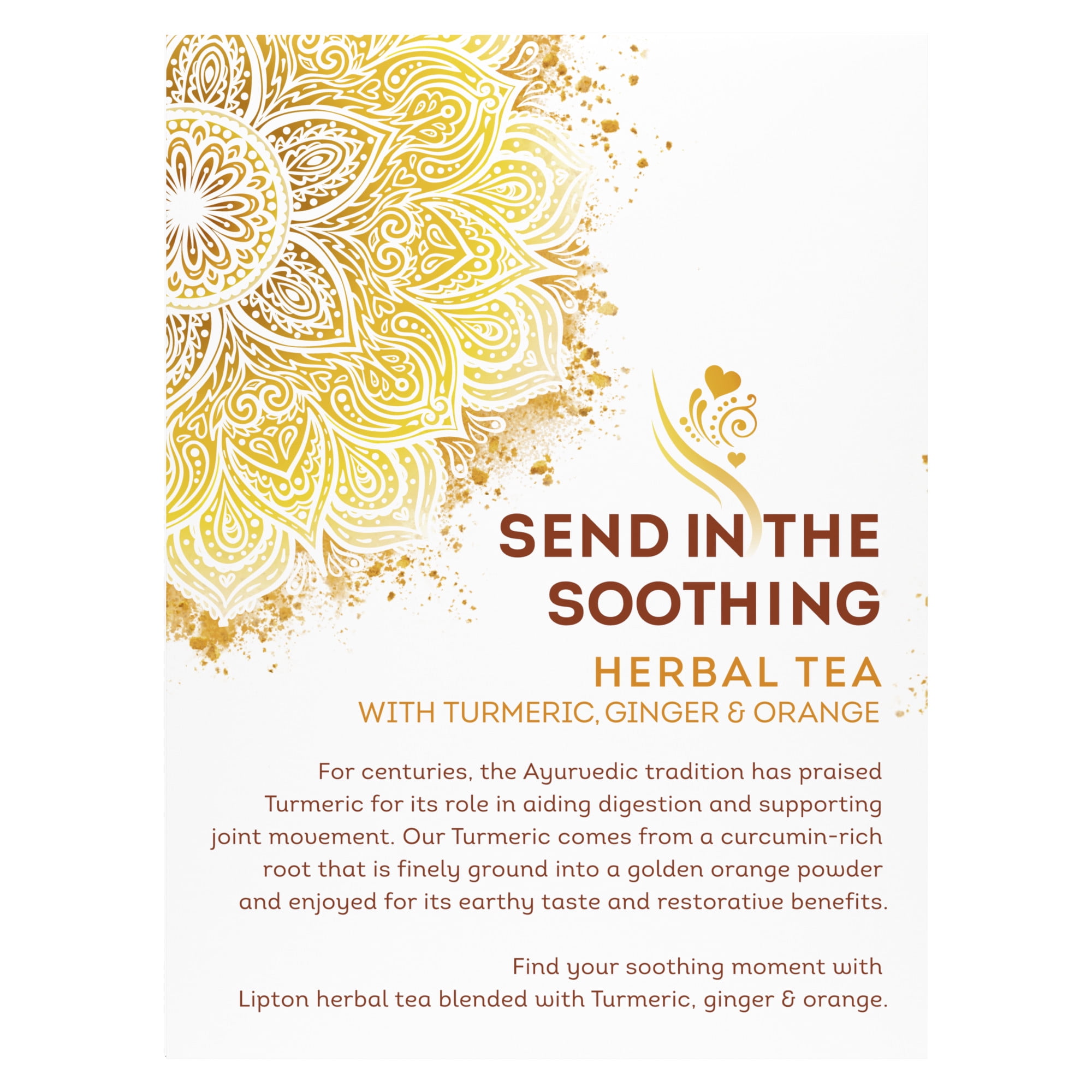 Send in the soothing with Lipton Terrific Turmeric herbal tea bags featuring turmeric, ginger & orange. For centuries, the Ayurvedic tradition has praised Turmeric for its role in aiding digestion and supporting joint movement. Our Turmeric comes from a curcumin-rich root that is finely ground into a golden orange powder and enjoyed for its earthy taste and restorative benefits. Find your soothing moment with Lipton tea blended with Turmeric, ginger & orange. Take a Turmeric time out. Reset and restore while you enjoy a daily cup or two. Caffeine Free Tea you can enjoy day or night. For the perfect cup brew 4-6 minutes in freshly boiled water. For a refreshingly cool take, add ice. Enjoy! Wellbeing by Lipton, a cup a day for well-being your way. Lipton offers a cup a day for well-being your way. Our range of products will enhance your wellness routine: – New Lipton Herbal teas supplements made with carefully selected botanicals and blended with essential oils. Crafted for those moments in life when you need some extra self-care. – Green tea, which may help support a healthy heart. Unsweetened Lipton 100% Natural Green Tea contains about 150mg flavonoids per serving. A daily consumption of at least 400mg flavonoids may help maintain a healthy heart as part of a diet consistent with dietary guidelines. – Lipton Magnificent Matcha with green tea helps you find your focus while delivering the smooth, earthy taste of matcha and the goodness of green tea. Its the perfect addition to a healthy lifestyle!