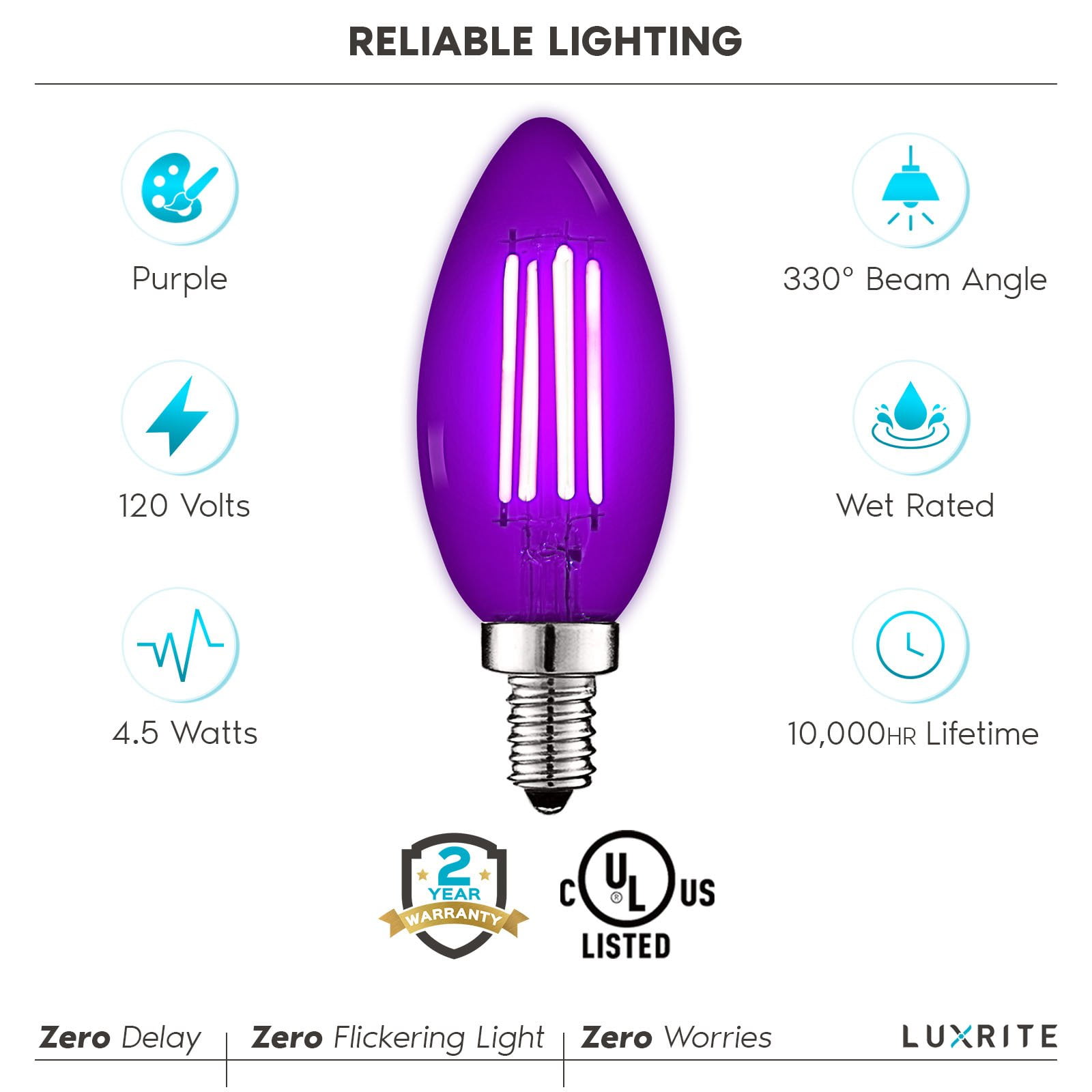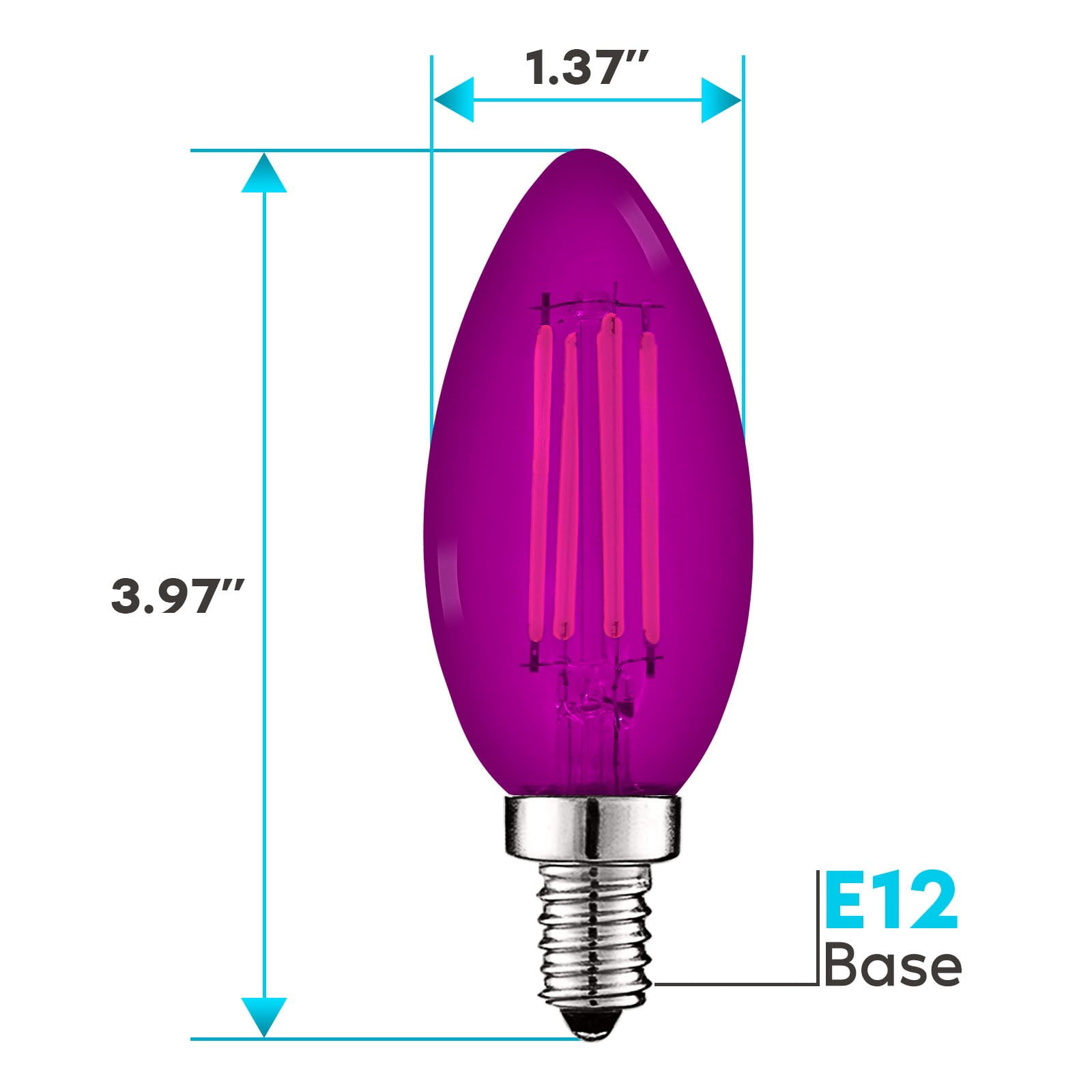 - RELIABLE LIGHTING – Zero flickering light, zero delay, and zero worries when you use these purple light bulbs e12 in your indoor and outdoor space. Each candle bulb is quick to install, has a small E12 base, wet location rated for reliability, comes UL listed for your safety, and backed by a 2 YEAR WARRANTY.