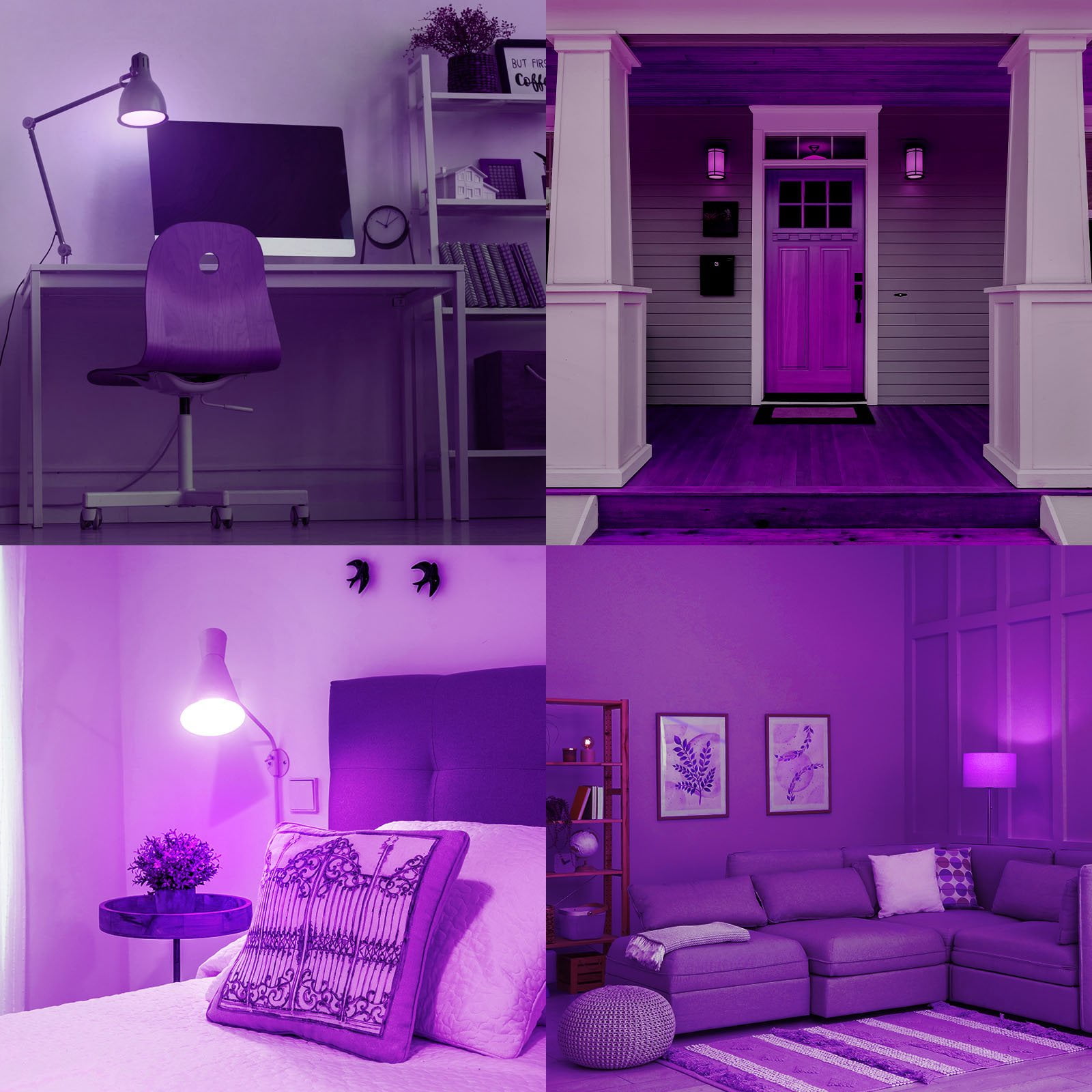 - COLORFUL LIGHT – Each led purple light bulb provides bright and vibrant colored light to any space of your home. Whether you want to use these indoors or outdoors, these lights are wet location rated to work in your preferred location. Bring color to your life with a purple bulb that will show your spirit during Halloween, events, parties and are ideal to use in your porch, sconce, post lamp, chandelier, ceiling fan, or as accent lighting.