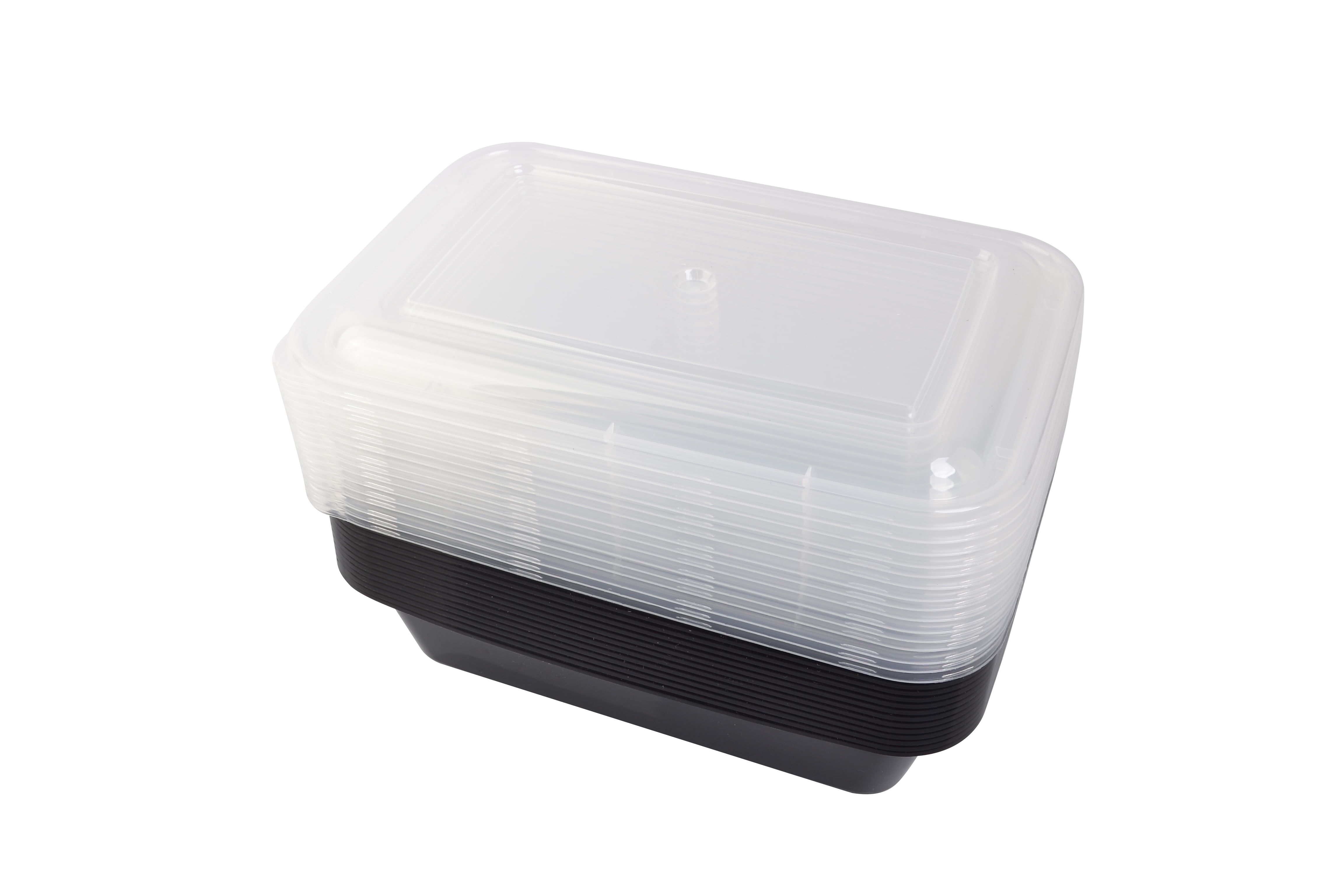 Mainstays Meal Prep Containers, 15 Pack includes a total of 30 pieces with 15 lids + 15 containers. Hassle-free, reusable design is microwaveable and safe to use on the top rack of a dishwasher. Holds up to 4.2 cups total. Includes 15 black-colored bases and 15 transparent lids. Space-saving stackable design helps conserve space in kitchen cupboards and shelves.