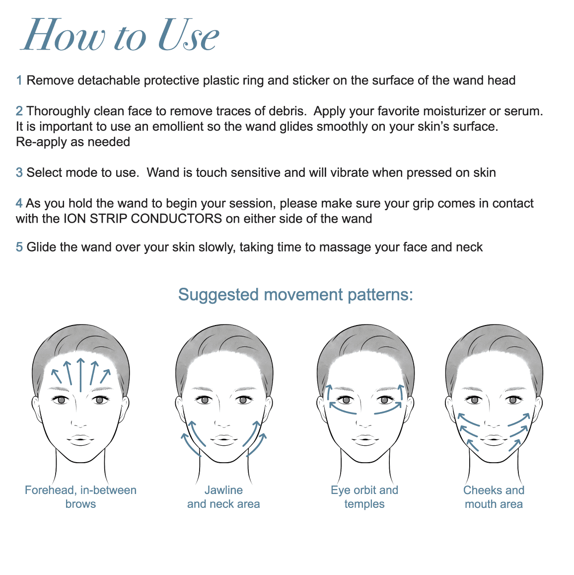 - Gently massage your face with the wand. The wand shuts off automatically after 20 minutes of use. To turn off manually, hold down the ON/OFF button.