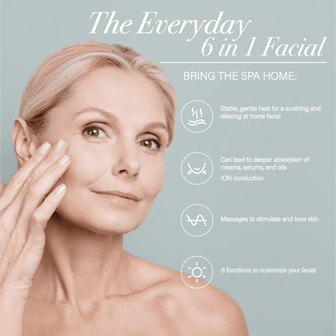 Stable, gentle heat and microcurrent massages your face and allows for deeper penetration of your favorite moisturizer and serums.