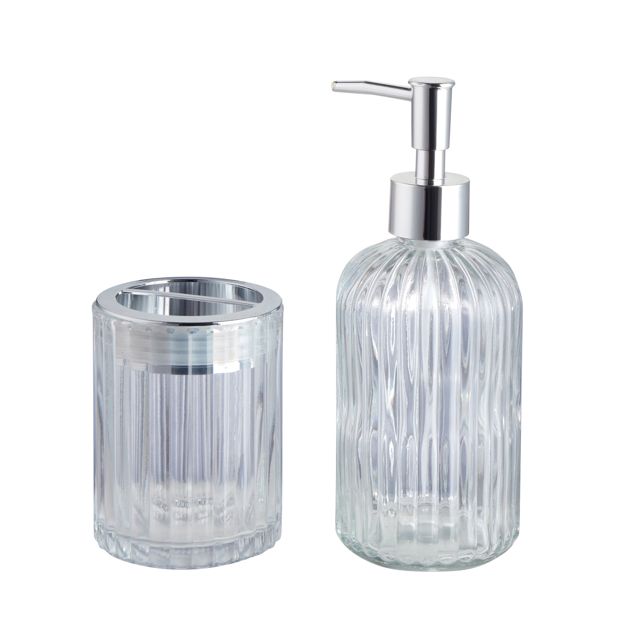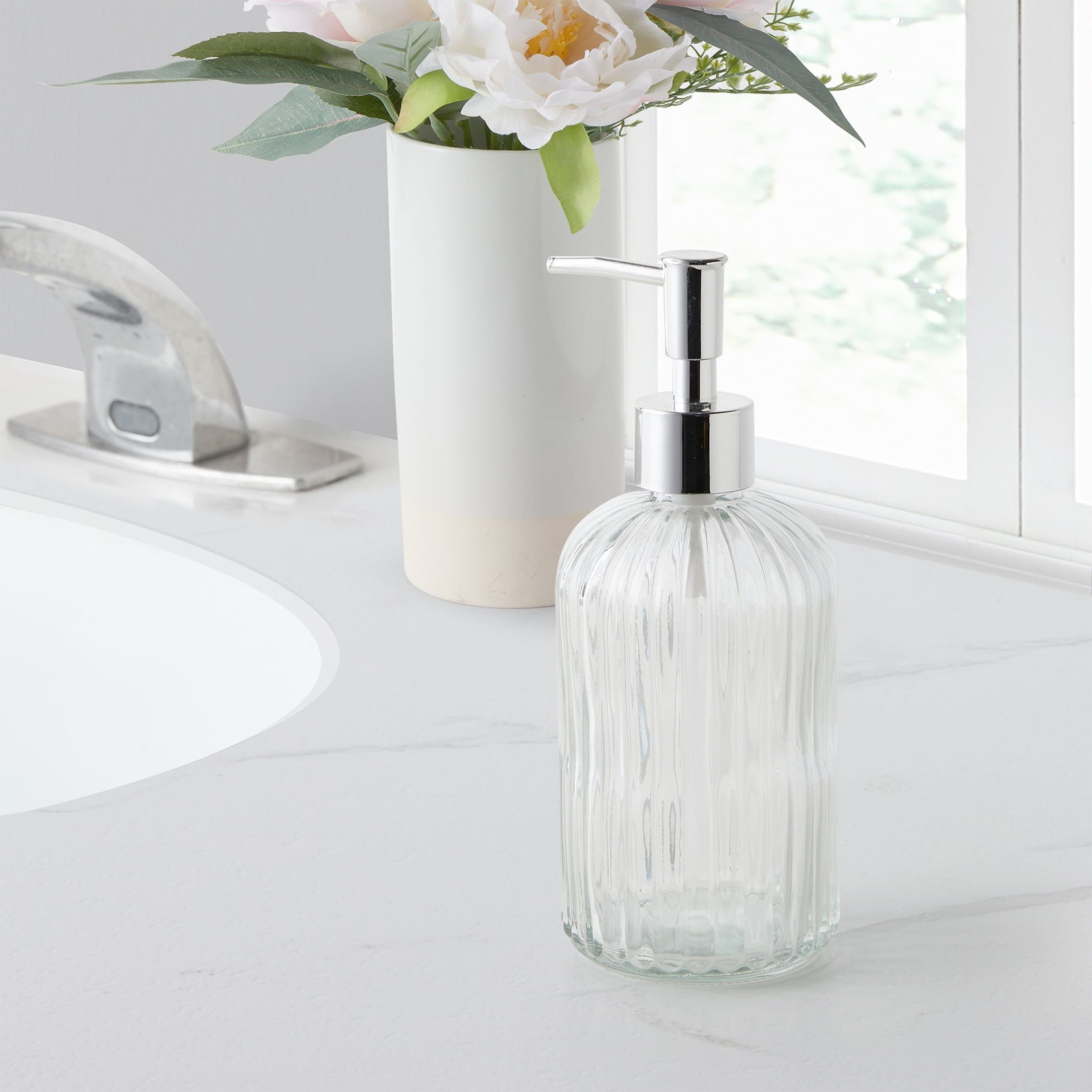 Instantly elevate your sink or bathroom vanity’s look with the My Texas House Lancaster Ribbed Glass Soap Pump. An effortlessly elegant addition to your master bath or guest bath décor, this clear glass soap dispenser has a timeless ribbed textured stripe design and silver hardware. The versatile design can be used in the bathroom, kitchen, laundry room and more. This soap pump can dispense liquid soaps, lotions, or moisturizers and coordinates perfectly with My Texas House Lancaster Collection bath accessories. You can keep this soap pump looking like new by gently wiping it clean