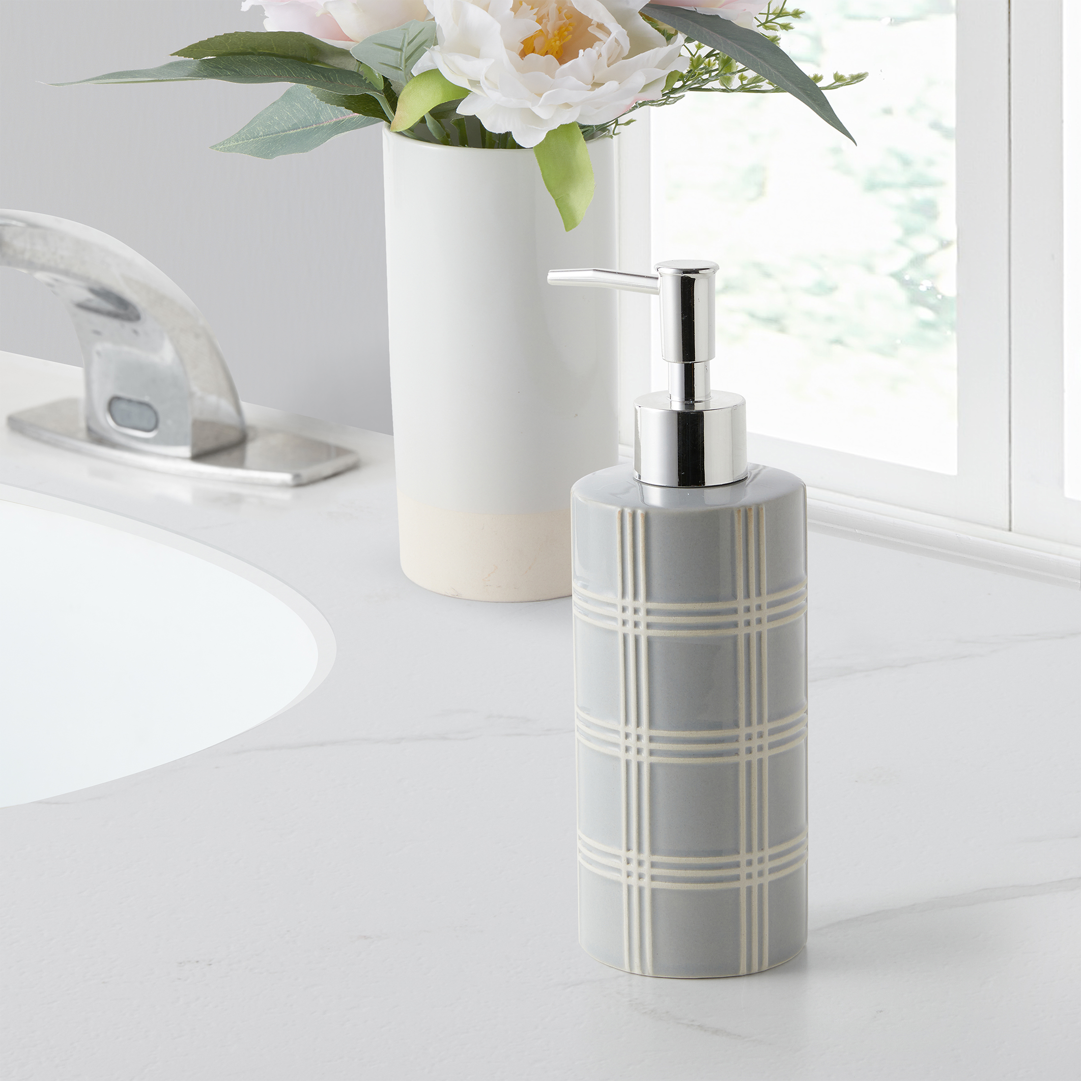 Instantly upgrade your sink or bathroom vanity’s look with the My Texas House Stafford Ceramic Embossed Plaid Soap Pump. An effortlessly stylish addition to your master bath or guest bath décor, this ceramic soap dispenser has silver hardware and embossed plaid designs for a textured look and feel. The versatile design can be used in the bathroom, kitchen, laundry room, and more. This soap pump can dispense liquid soaps, lotions, or moisturizers and coordinates perfectly with My Texas House Stafford Collection bath accessories. You can keep this soap pump looking like new by gently wiping it clean