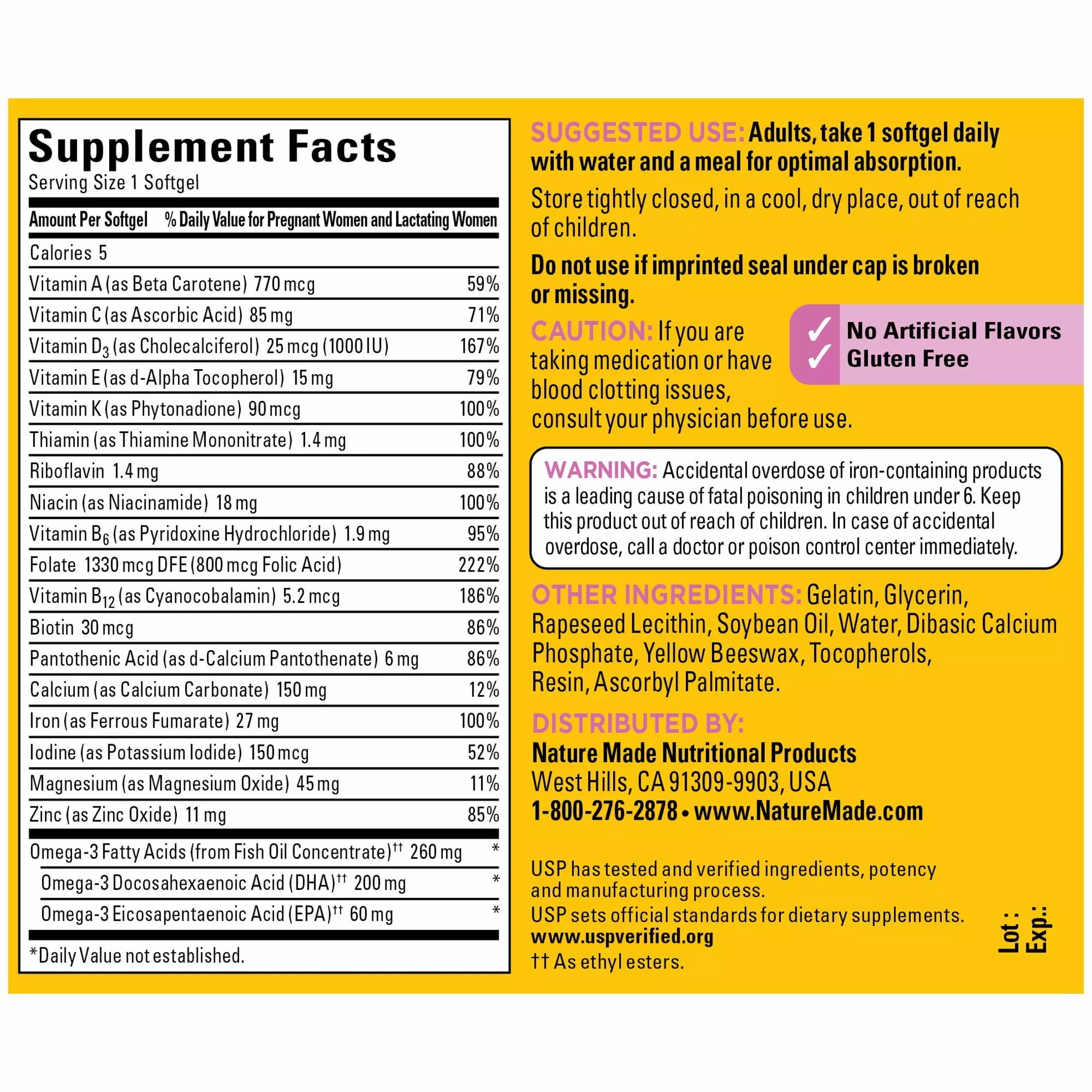 Nature Made Prenatal Multivitamin with 200 mg DHA Softgels are prenatal multivitamins scientifically formulated to support the development of a baby’s brain, nervous system, bones, and eyes while also supporting mom’s health. Sourced from high-quality ingredients, this gluten free multivitamin for women is a dietary supplement that contains no artificial flavors. This Nature Made Prenatal multivitamin supplement for women contains Folic Acid and 19 other nutrients, including DHA, an Omega-3 that may help support fetal brain and eye development. This prenatal supplement also has clinically proven absorption of Folic Acid and Iron. This Nature Made Prenatal with DHA multivitamin provides 19 essential nutrients plus DHA, including Calcium and Vitamin D3 for bone health, Vitamin A, Vitamin C, Vitamin D, and Zinc to help support the immune system, and all 8 B vitamins to support cellular energy production. Vitamin E and Vitamin C in this Nature Made women’s multivitamin also provide antioxidant support. Adults take one of these prenatal supplement softgels daily with water and a meal. Nature Made supplements are quality you can trust. USP has tested and verified ingredients, potency and manufacturing process. USP sets official standards for dietary supplements.