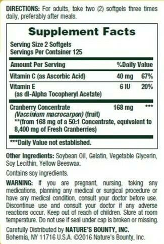The company for all your vitamin and nutritional needs. Active Ingredients: 1 Softgel: Vitamin C (as Ascorbic Acid) 100 mg; Vitamin E (as d-Alpha Tocopheryl Acetate) 3 IU; Cranberry Concentrate Powder 140 mg [(Vaccinium Macrocarpon) (Fruit) (From 12:1 Concentrate) (Equivalent to 1680 mg of Fresh Cranberries); Gelatin; Soybean Oil; Glycerin; Soy Lecithin; Yellow Beeswax Uses: Cranberries help support the integrity of bladder walls to promote urinary health.* This product also contains Vitamin C, an antioxidant that plays a role in supporting immune function.* Gluten free.