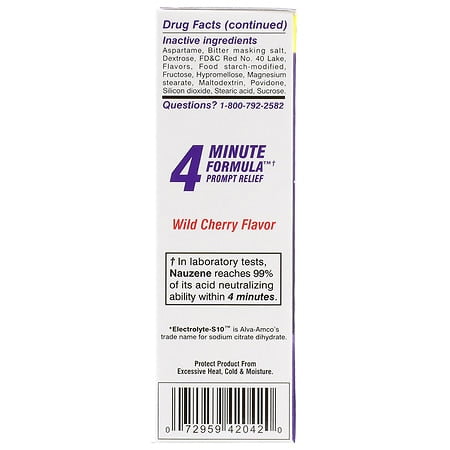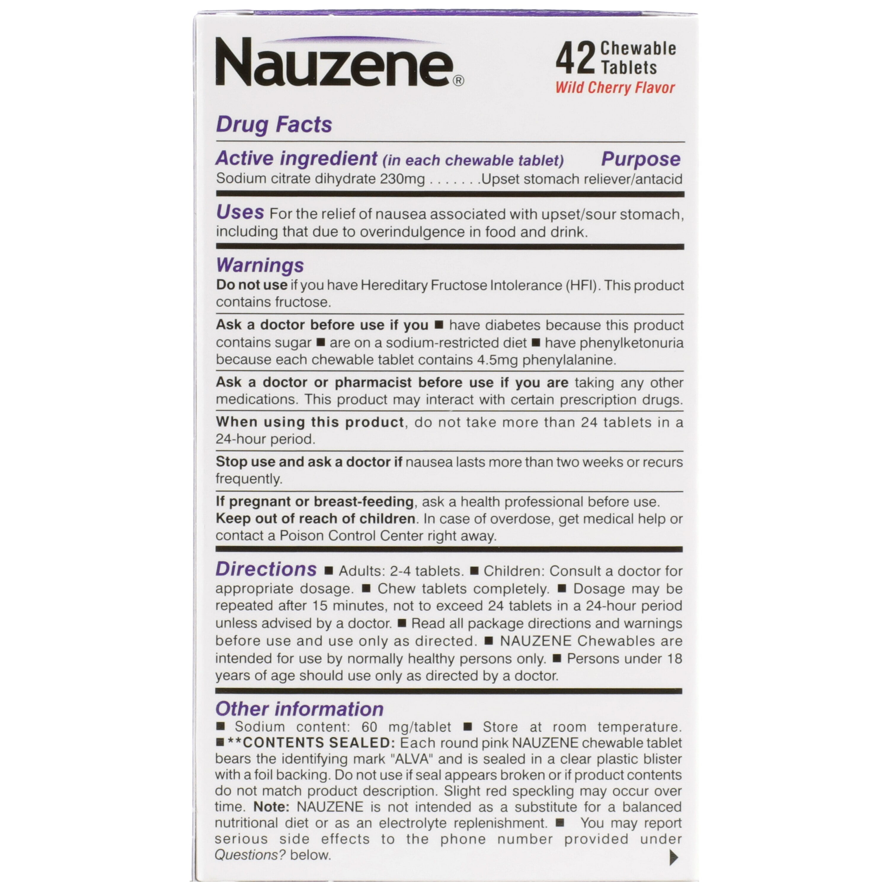 Other Information: Sodium content: 54 mg/tablet; store at room temperature; Misc: Doctor recommended. For relief of upset stomach including nausea. Prompt relief. No aspirin. No salicylates. With Electrolyte-S-10 (Electrolyte-S10 is Alva-Amco’s trade name for sodium citrate dihydrate). 4 minute formula (in laboratory tests, Nauzene reaches 99% of its acid neutralizing ability within 4 minutes). Contents sealed (each round pink Nauzene chewable tablet bears the identifying mark ALVA and is sealed in a clear plastic blister with a foil backing). You may report serious side effects to the phone number provided under Questions? below. Gluten free