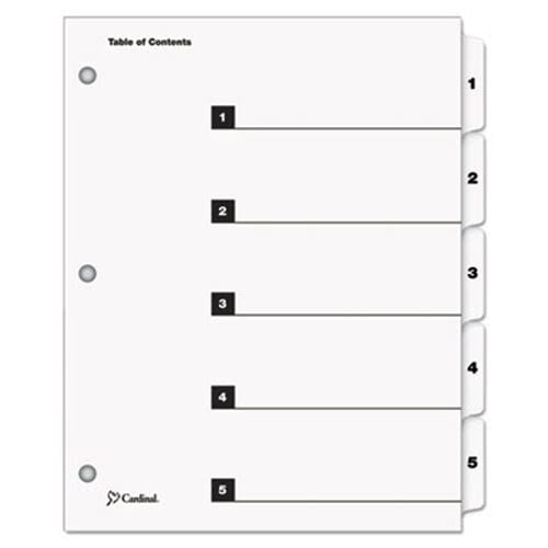 Traditional OneStep Index System Create multiple sets of professional-looking custom index sets in minutes using your laser or inkjet printer or copier. Mylar® reinforced tabs and content sheet. Three-hole punched for use in standard ring binders. Free software templates available on manufacturer’s website. Tab Style: 5-Tab; Tab Color(s): White; Index Divider Size: 11 x 8 1/2.Cardinal OneStep Index System, 5-Tab, 1-5, Letter, White, 5 Sheets