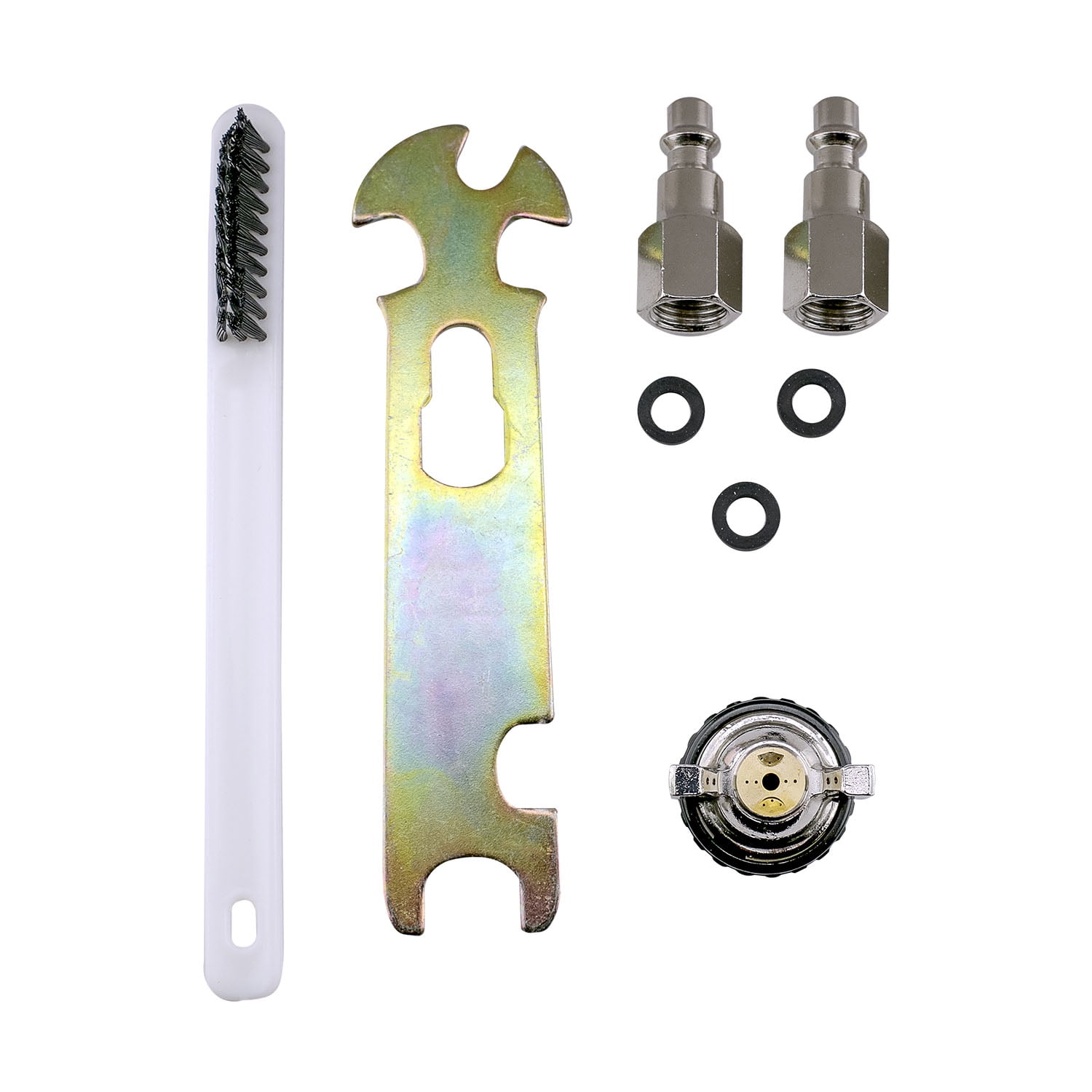 - Includes regulator, standard and automotive air connectors, cleaning kit, and adjustment tool