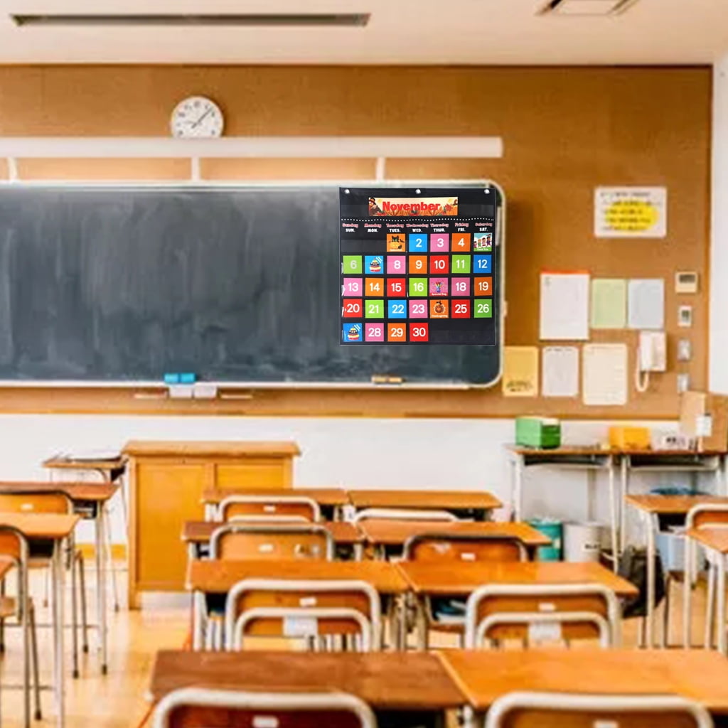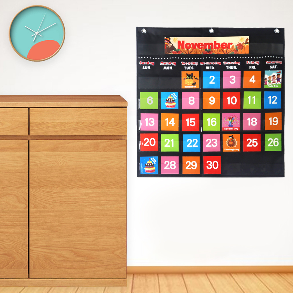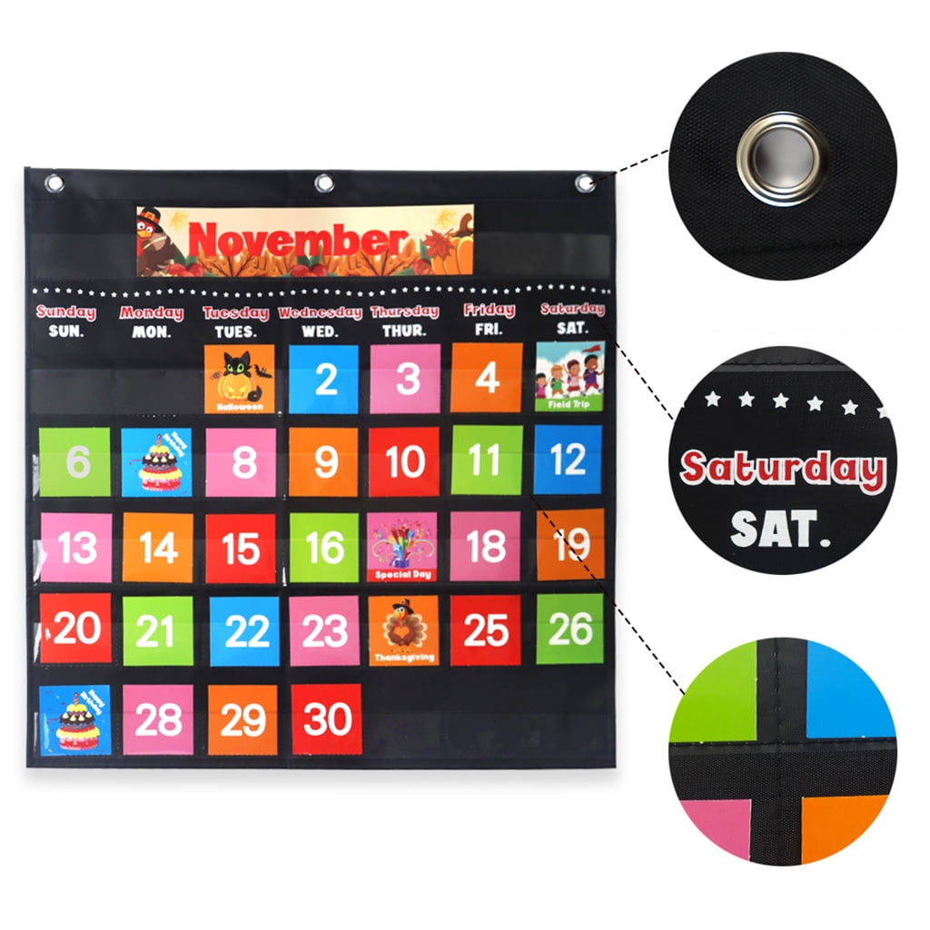 - PROFESSIONAL DESIGN. Hanging calender style pocket chart design. Features 88 full-color words and picture cards, including days & months; seasonal happenings; holidays; etc. 3 sturdy heavy duty metal hanging holes; clear cards holder windows. All these detailed features make it a perfect home or classroom teaching aid.