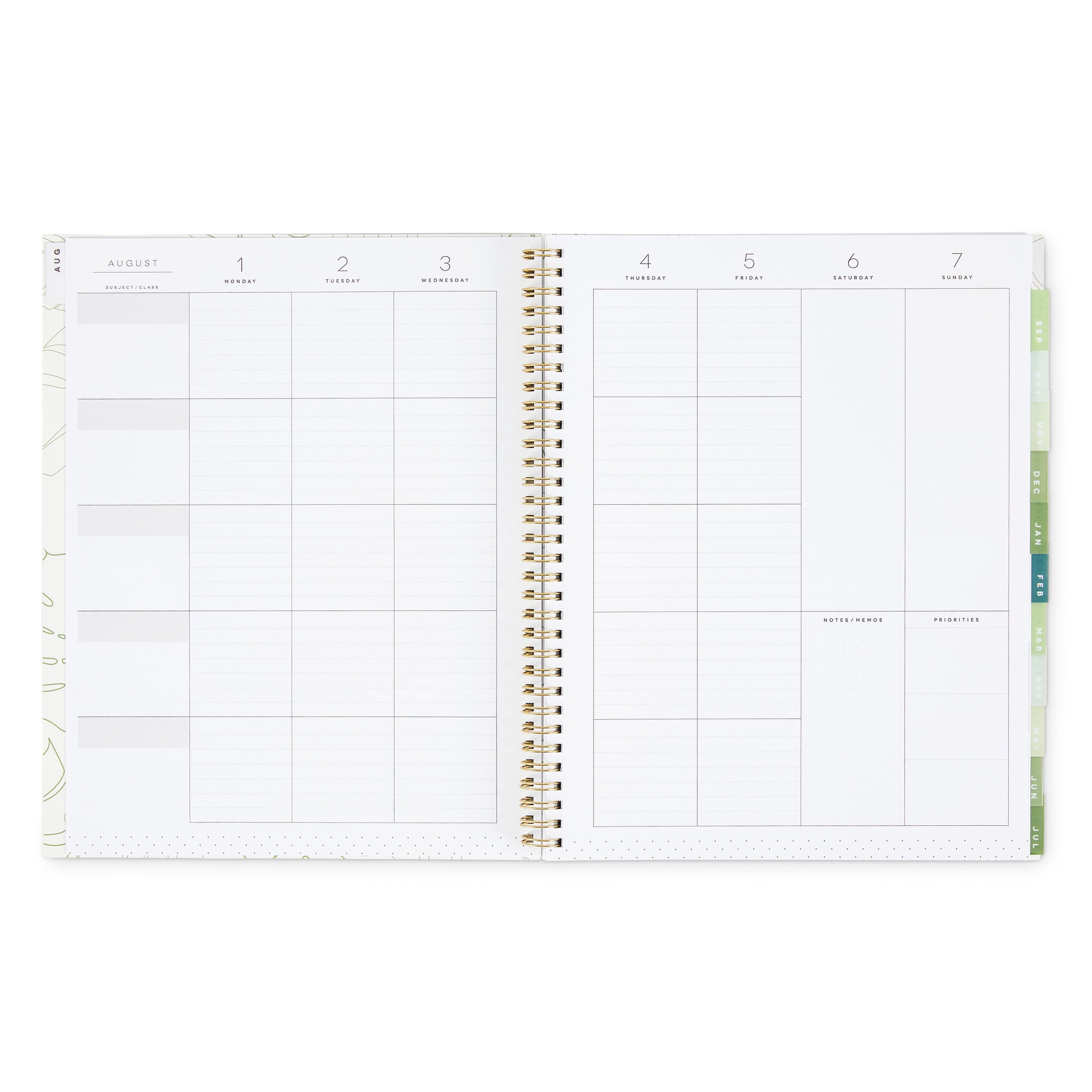 Organized by Happy Planner is the complete planning solution. The academic layout is perfect for teachers and students. This dated 12-month planner runs from August 2022-July 2023. It comes with clear anti-scratch covers with a full color design sheet. The 12 dividers feature 6 colorful designs with botanical monstera plant inspired designs and laminated tabs. This planner features a metal twin loop binding—a streamlined design, perfect for your backpack or work tote. The academic layout features an unlabeled vertical column for classes/subjects and vertical boxes for each day of the week. It includes a section to list priorities and any additional notes.