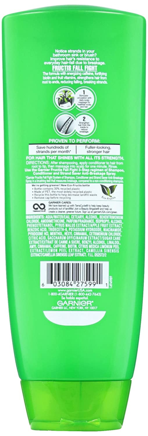 Noticing hair in your bathroom sink or brush. Fight back with the new fall fight 3-step system. Fall fight from garnier fructis helps improve hairs resistance to everyday hair-fall. The formulas with energizing caffeine, fortifying biotin and fruit vitamins, strengthen hair from root to ends, reducing falling, breaking strands. The result is stronger, fuller-looking hair. Strengthen hair from the inside out to reduce breakage Save up to 1500 strands of hair per month Fuller-looking hair after just one useNoticing hair in your bathroom sink or brush. Fight back with the new fall fight 3-step system. Fall fight from garnier fructis helps improve hairs resistance to everyday hair-fall. The formulas with energizing caffeine, fortifying biotin and fruit vitamins, strengthen hair from root to ends, reducing falling, breaking strands. The result is stronger, fuller-looking hair.Pack of (3) Garnier Fructis Fall Fight Conditioner For Falling Breaking Hair, 13 Fluid Ounce