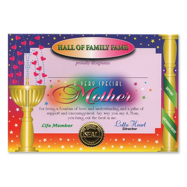 Need something to add to your Mother’s day gift or just want to show your Mom how much you care get her these ”Very Special Mother” certificates. Each certificate has a rainbow border with white and gold stars, also has a picture of a gold fountain with hearts pouring out and there’s a picture of a gold pillar with a green ribbon around it with the words ”Support” and ”Enforcement” in white. Also has a heart warming message. Each certificate has a official looking golden seal. Dimensions: 5”H x 7”W. Material(s): card-stock material. Pack includes 6 of the item shown