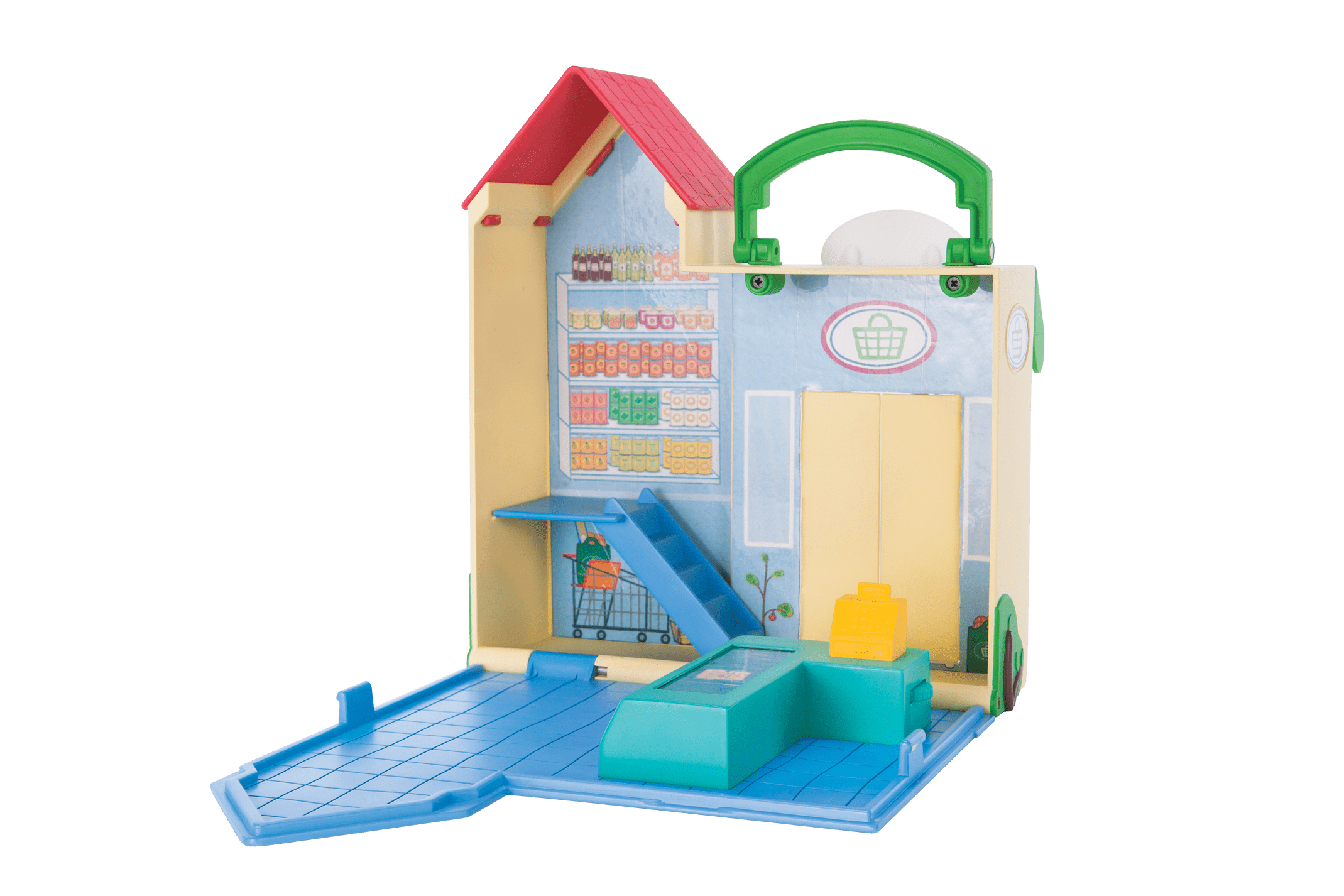 Peppa Pig Little Grocery Store Playset Let’s make a trip to the Little Grocery Store! Look! You can see groceries in the windows. Open up the Little Grocery Store to reveal a market complete with shopping cart and Peppa Pig figure. Take the grocery store with you wherever you go. The store closes to become a carrying case complete with handle. Built in scale with your favorite Peppa Pig playsets, this Little Grocery Store will help make your collection complete.