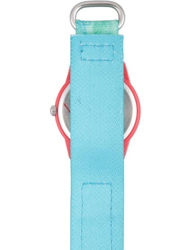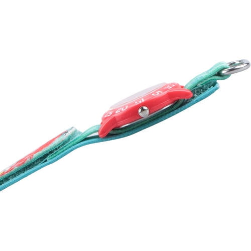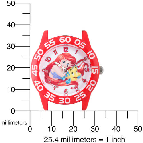 This Disney Princess Ariel Girls’ Red Plastic Time Teacher Watch features a green stretch hook and loop nylon strap with printed Ariel.