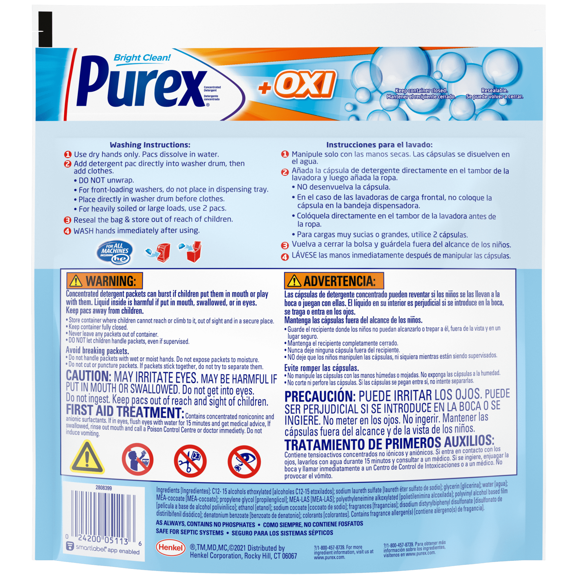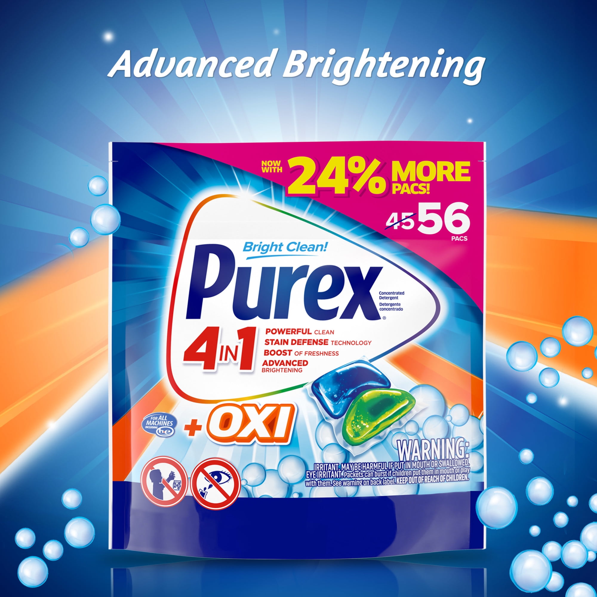 - This package contains one pouch of Purex 4-in-1 + OXI Laundry Detergent Pacs in a Fresh Morning Burst scent, enough for 56 wash loads