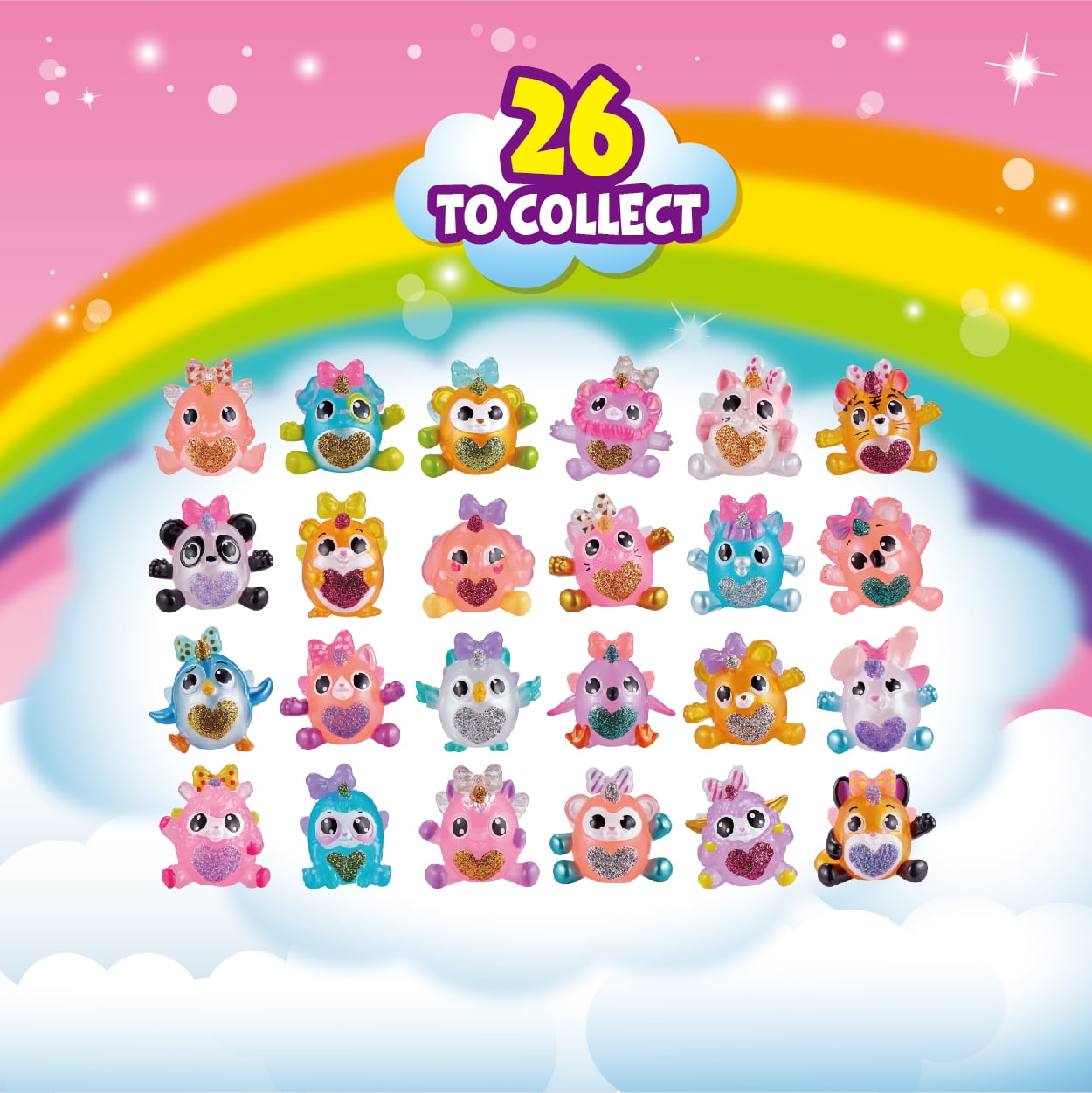 Hatch open the Itzy Glitzy surprise eggs to meet the new Itzy Glitzy Rainbocorns and all their glitzy surprises! There are 26 Itzy Glitzy characters to collect, including the rare golden unicorn and silver flamingocorn! The Itzy Glitzy’s come with so many surprises, including hair clips, rings, bows, wings and pop and swap heart gems! Your Itzy Gltizy character can even be used as a pencil topper! Mix and match the wings and heart between your Itzy Glitzy’s and ring, and collect and swap them all! Who will you find!