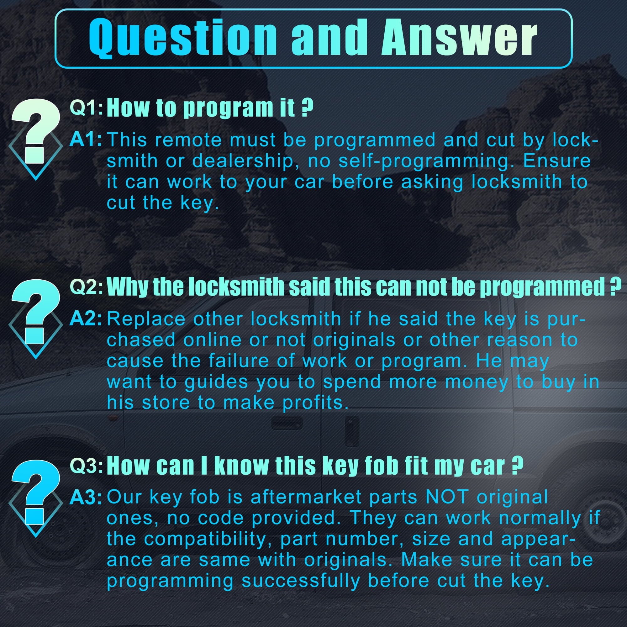Fitment: for Chrysler Town & Country 2004-2007, for Dodge Grand Caravan 2004-2007, for Dodge Caravan 2004-2007. Feature: This is a non-OEM product, accessory only! Please check the above part number. Please be sure that your vehicle is listed on the fitment. Also, Please make sure that your current key and remote as same as those pictures to insure that this replacement key fob will work for you. Be sure to match FCC id and part numbers with the current remote. Programming: This remote must be programmed and cut by a qualified locksmith or dealership. Note: 1.Please make sure the remote programming can work to your vehicle before asking the locksmith to cut the key. Don’t wait for him to cut the key and discover that it does not work, which may make a loss. 2.If the locksmith declares that the key is purchased online or is not an original part, or other reasons to cause it can’t work normally, and guides you to spend more money to buy in his store, maybe he wants to make more profits. I suggest you replace other locksmiths to program. How to replace battery? Take out the key and use the tip of screwdriver as a tool to open the back case, replace the same battery carefully. You can use a clean cloth to clean the battery in case some dushes existed. Package Included: 1 x Car Keyless Entry Remote (Battery included)This remote must be programmed and cut by a qualified locksmith or dealership(Need to pay extra money for programming or cutting)