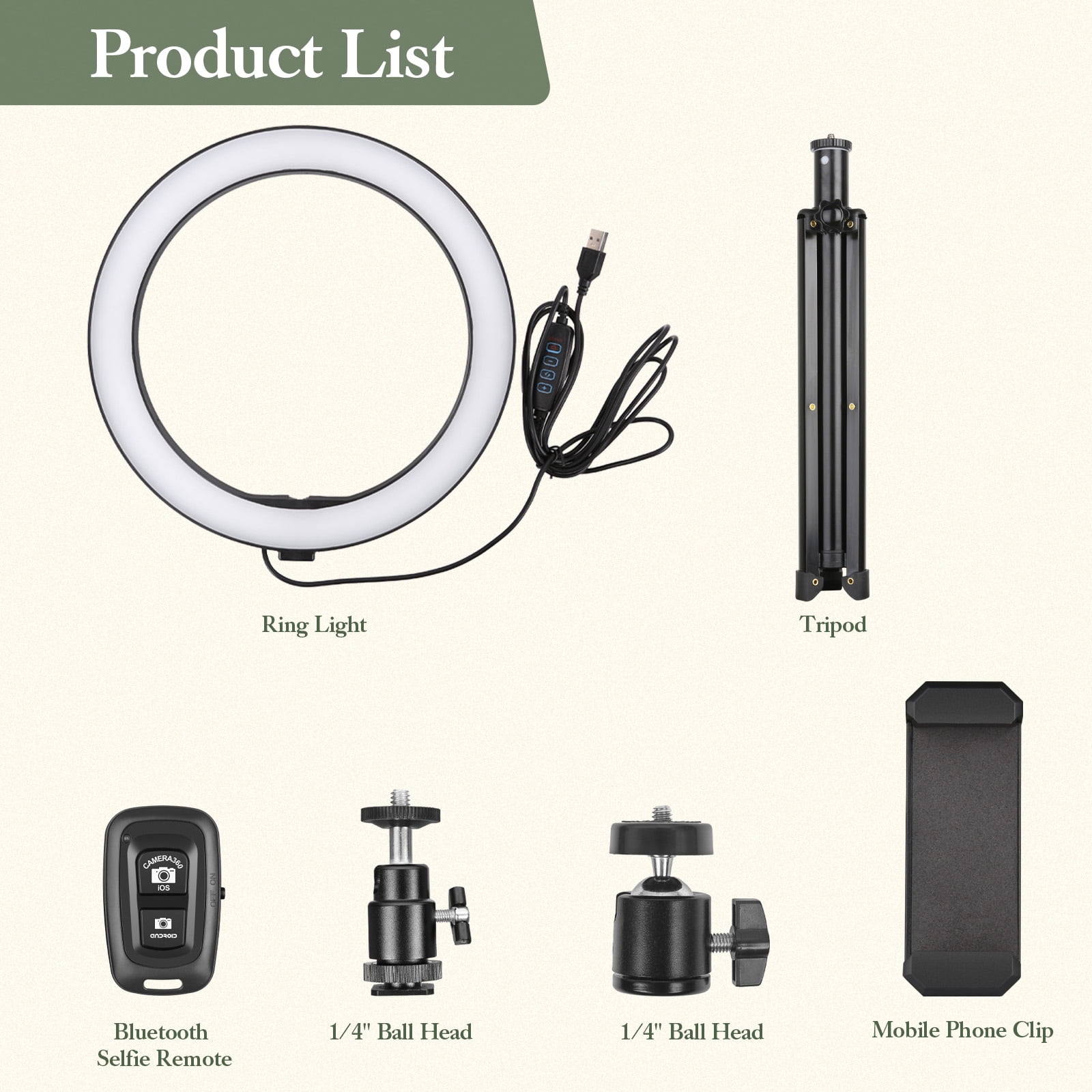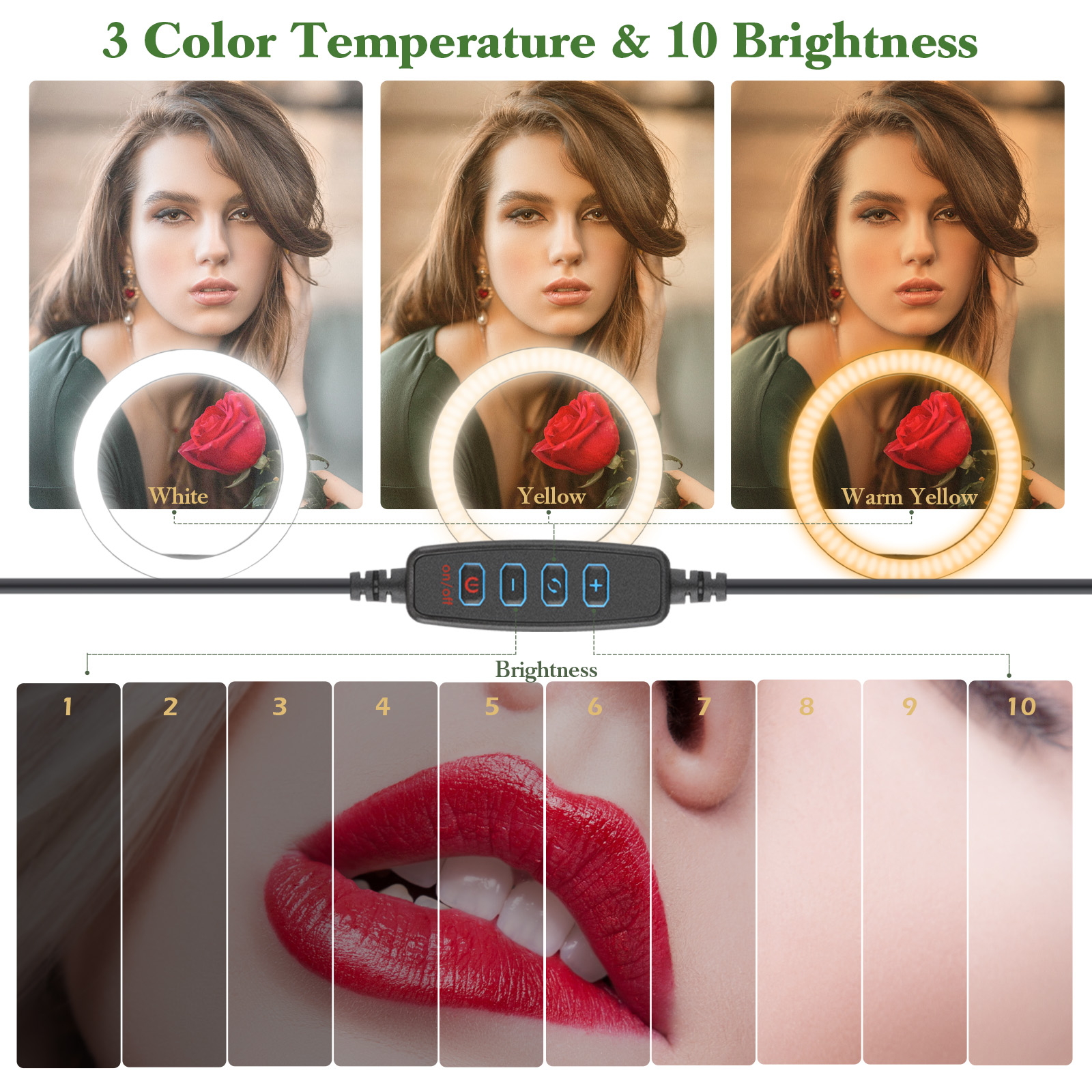 10" Ring Light features 3 light colors (Warm, Cool White, Daylight) and 10 levels brightness in each color, 30 options in total.Perfect fill light to meet your various light needs.