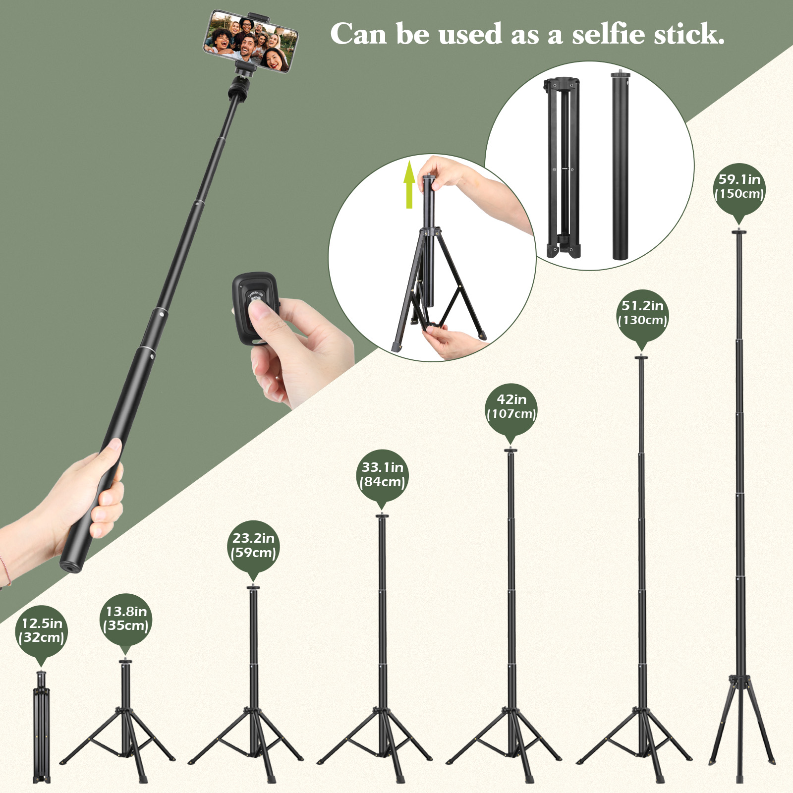 Extending from 13.6" to 59", the stable tripod can be adjusted to any height within as needed, short enough to stand on tabletop, tall enough to fit your height. And you can install a camera or phone on the top of the tripod stand, it can be used as a camera stand also.