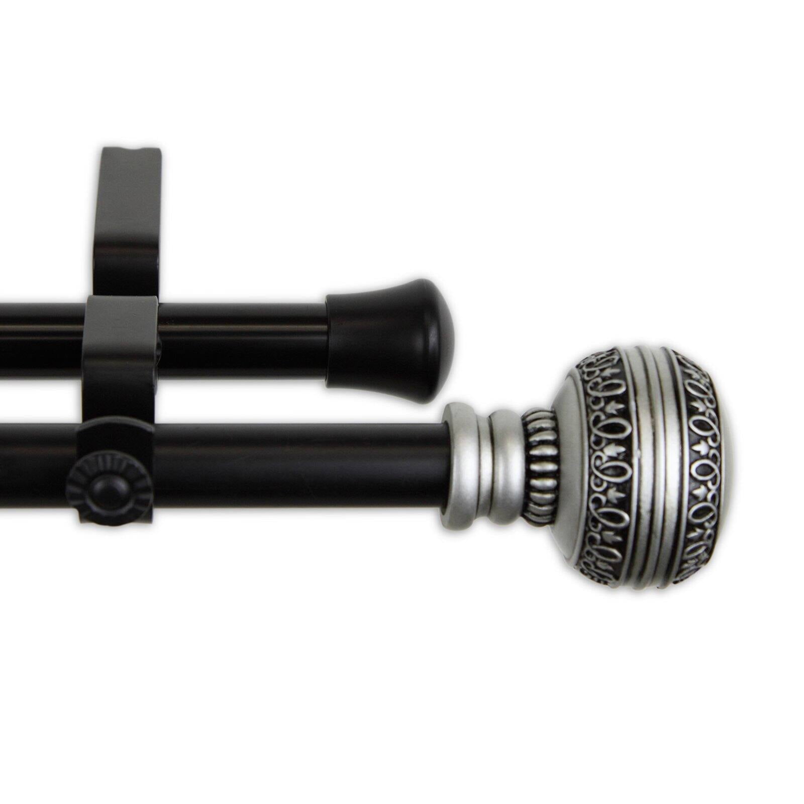 Offer a stately upgrade to any window in your home with the Rod Desyne Ornament Two-Tone Expandable Double Curtain Rod. This set of double curtain rods are made from thick metal with mounting brackets, finished in black. The rods feature plastic ball finials, with molded scrolled details and a satin nickel finish. Each rod expands to fit a variety of sizes. Select among the available sizes.
