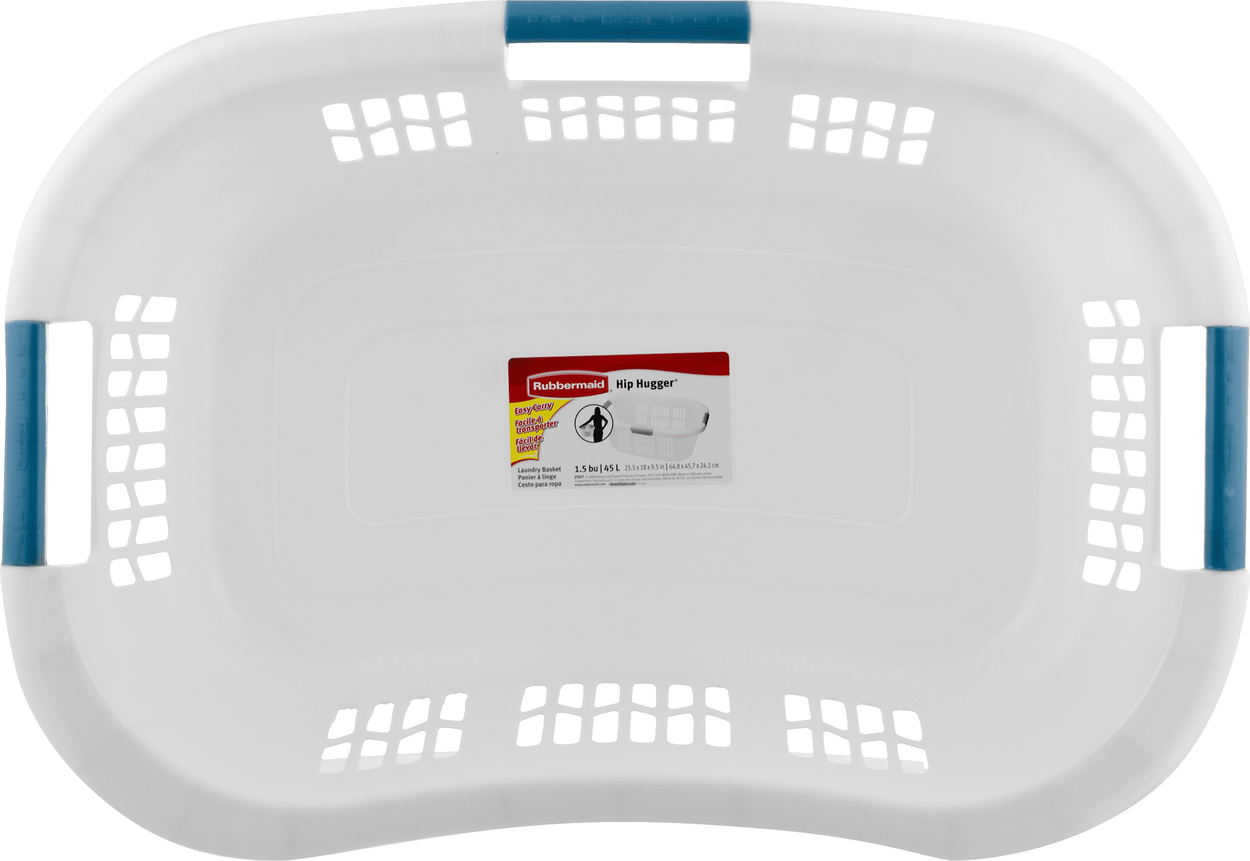 Rubbermaid Hip Hugger Laundry Basket FG299787WHT 3 Handle 1.5 Bushel White. Make trips to the laundromat or laundry room easy with the Rubbermaid Hip Hugger Laundry Basket. It’s made of a sturdy material in a space-saving design that’s ideal for apartments and dorm rooms and features an open top with large air holes that allow your laundry to breathe, so it can help prevent smells. This white plastic laundry basket also includes built-in molded handles for effortless transport to and from your destination. When it’s not in use, its compact design allows for easy storage in closets or above washers and dryers, where it can stay ready to be used for your next laundry day.The Rubbermaid Hip Hugger Laundry Basket works ideally for all of your laundry needs, while the shape allows it to sit comfortably on your hip when carrying it. It’s well-made and sturdy and is an ideal choice for carrying towels, jeans and other clothing straight to the laundry room or closet.3 sturdy grab-through handles for easy 1 or 2-handed lifting. Curved design sits on hip for comfortable, 1-handed carrying. Heavy-duty construction and smooth finish prevent snagging delicate items. 1.5 bushel (1.86 cubic feet). 25.75" x 17" x 9.5". .