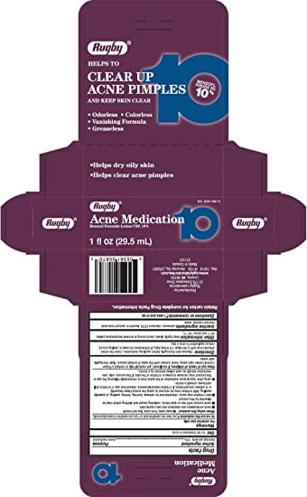 RUGBY BENZOYL PEROX LTN/ACNE MED 10% BENZOYL PEROXIDE-10% White 29.5ML UPC 305361058753 Generic Compare To BENZOYL PEROX LTN/ACNE MED 10%|Active Ingredients: BENZOYL PEROXIDE-10%, EDETATE DISODIUM-n/a, |Clears Acne Pimples||BENZOYL PEROX LTN/ACNE MED 10% BENZOYL PEROXIDE-10% White 29.5ML UPC 305361058753Rugby Acne Medication Benzoyl Peroxide Lotion 10% 1 oz (Pack of 3)