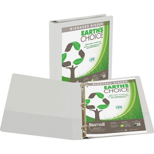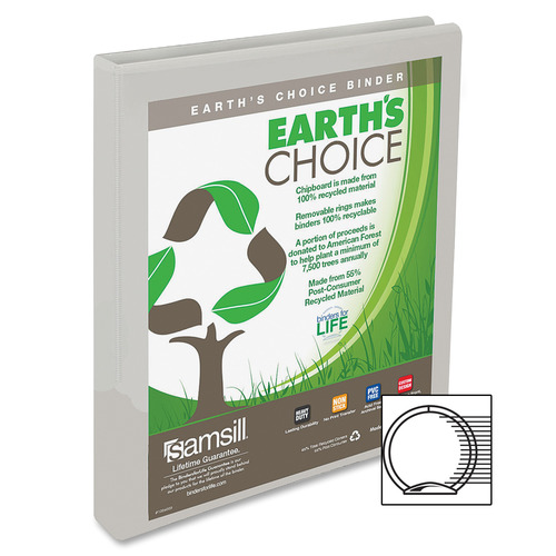 Eco-friendly view binder features removable rings that make the binder 100 percent recyclable. Sturdy chipboard core is made from recycled material, and the acid-free polypropylene is environmentally safe. A portion of the proceeds from each binder purchased is donated to American Forests to help plant a minimum of 7,500 trees annually. Clear overlays on front, back, and spine allow easy customization. Locking metal round rings are mounted on the back cover to reduce wear and let letter-size pages lie flat. 1" capacity holds approximately 225 sheets. Two, clear inside pockets store additional loose papers. Design also includes exposed rivets.
