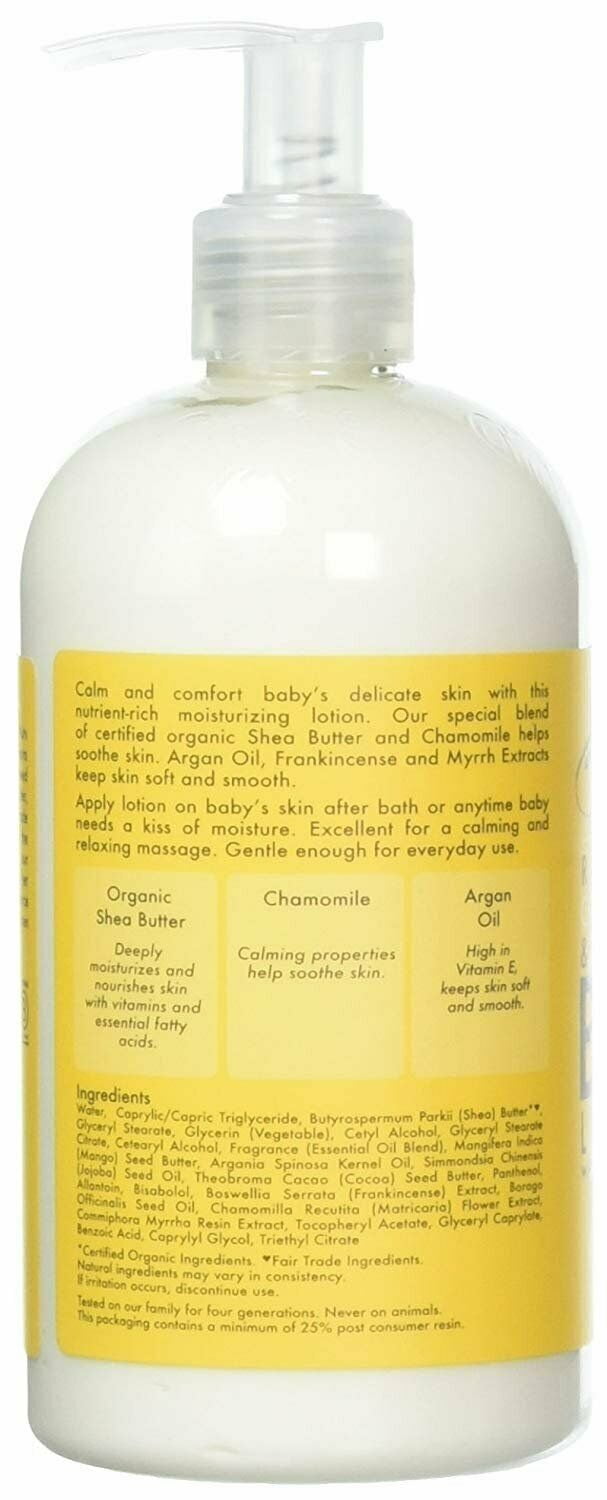 Shea Moisture Raw Shea, Chamomile & Argan Oil Baby Lotion for baby is gentle enough for baby’s soft skin. Calm and comfort baby’s delicate skin with this nutrient-rich moisturizing lotion. Our special blend of Chamomile and Fair Trade Shea Butter helps soothe skin. Argan Oil, Frankincense and Myrrh Extracts keep skin soft and smooth. Apply lotion on baby’s skin after bath or anytime baby needs a kiss of moisture. Excellent for a calming and relaxing massage. Gentle enough for everyday use. This baby lotion is excellent for a calming and relaxing massage. Gentle enough for everyday use on baby skin and suitable for all ages. Great baby cream for dry skin. BRAND STORY: Sofi Tucker started selling Shea Nuts at the village market in Bonthe, Sierra Leone in 1912. By age 19, the widowed mother of four was selling Shea Butter, African Black Soap and her homemade hair and skin preparations all over the countryside. Sofi Tucker was our Grandmother and SheaMoisture is her legacy. With this purchase you help empower disadvantaged women to realize a brighter, healthier future. Ethically Traded Ingredients Sustainably Produced. Pioneering Community Commerce and Fair Trade Since 1912. Tested on the Tucker family for four generations. Never on animals.