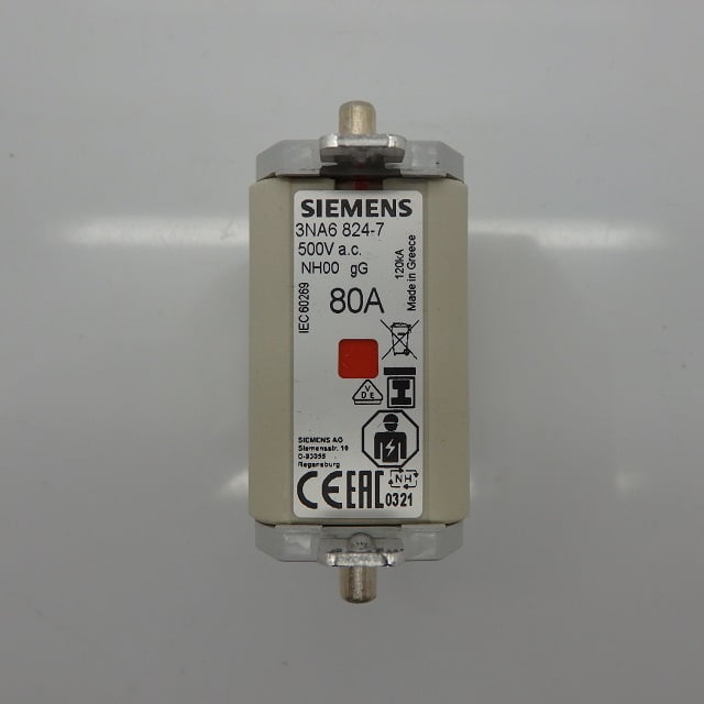 Siemens 500VAC 00 NH 80A gG Centred Tag Fuse 3NA6824-7Siemens